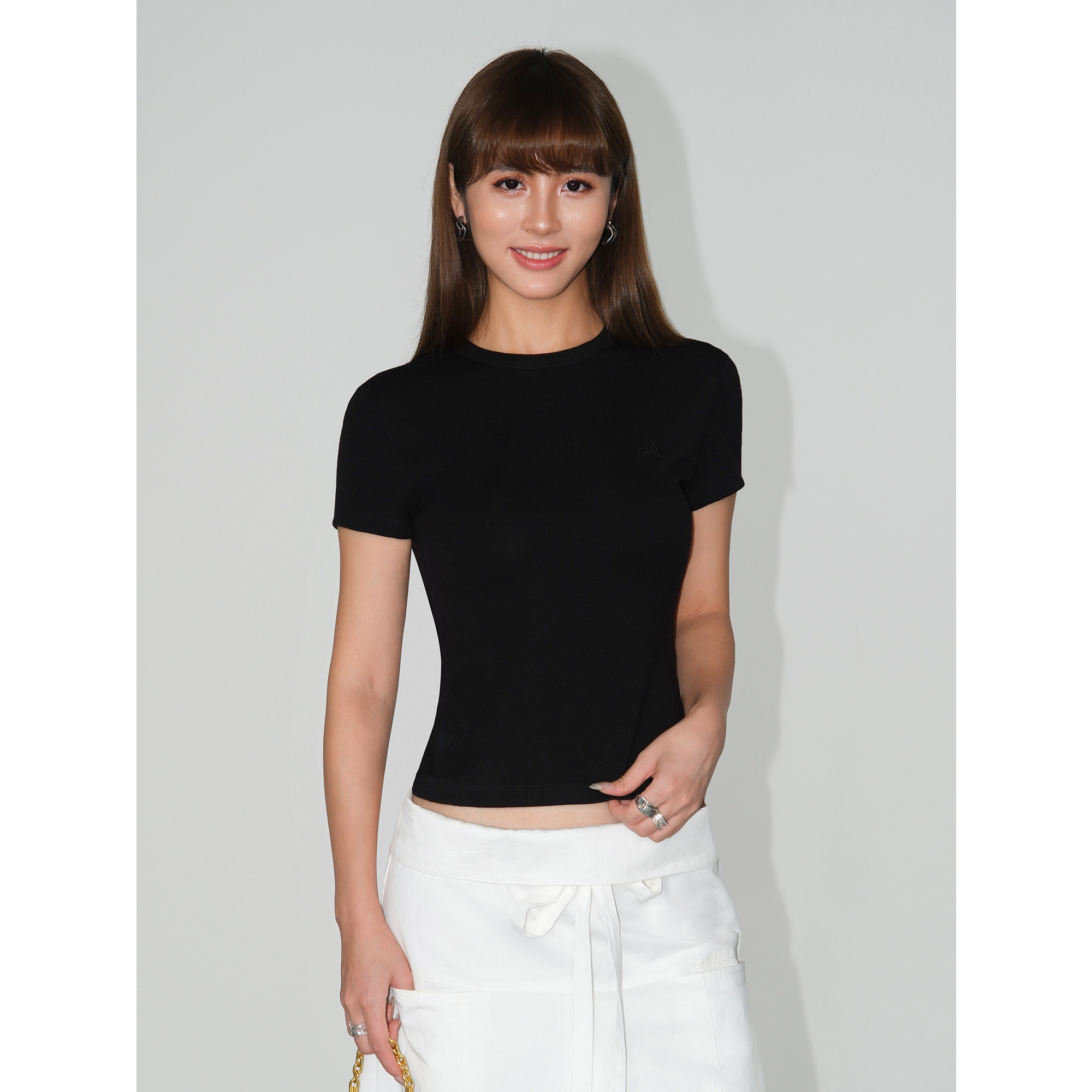 NEVA HU 蝴蝶结刺绣短袖T恤女夏季简约圆领修身短款针织正肩上衣