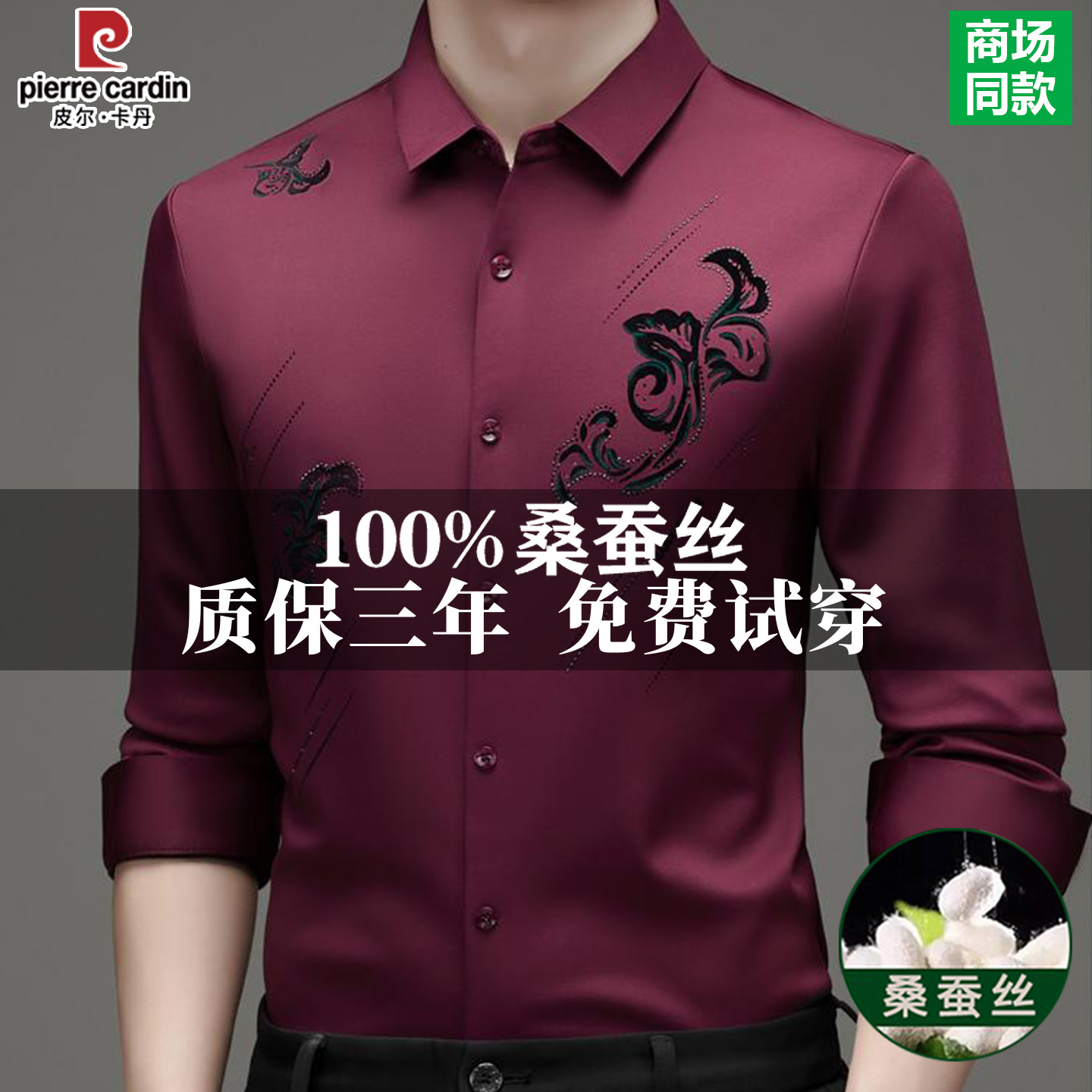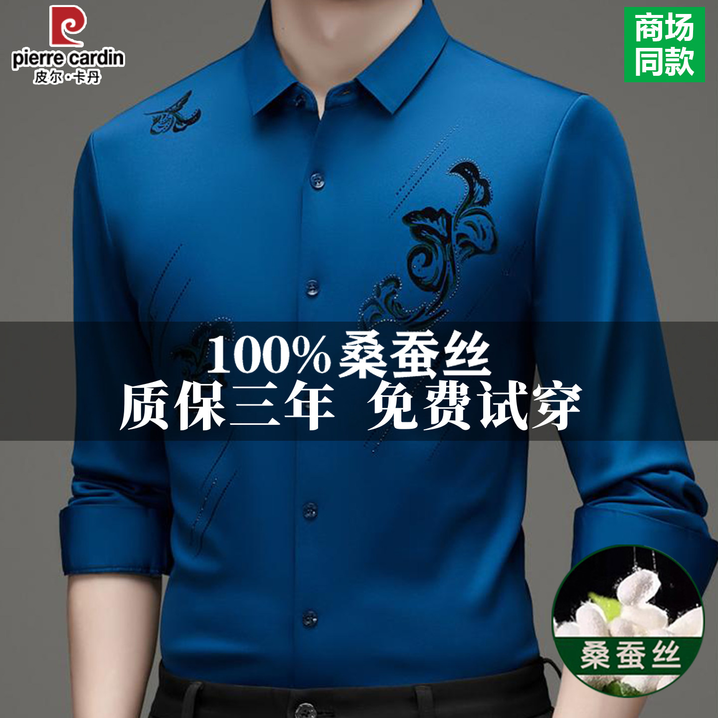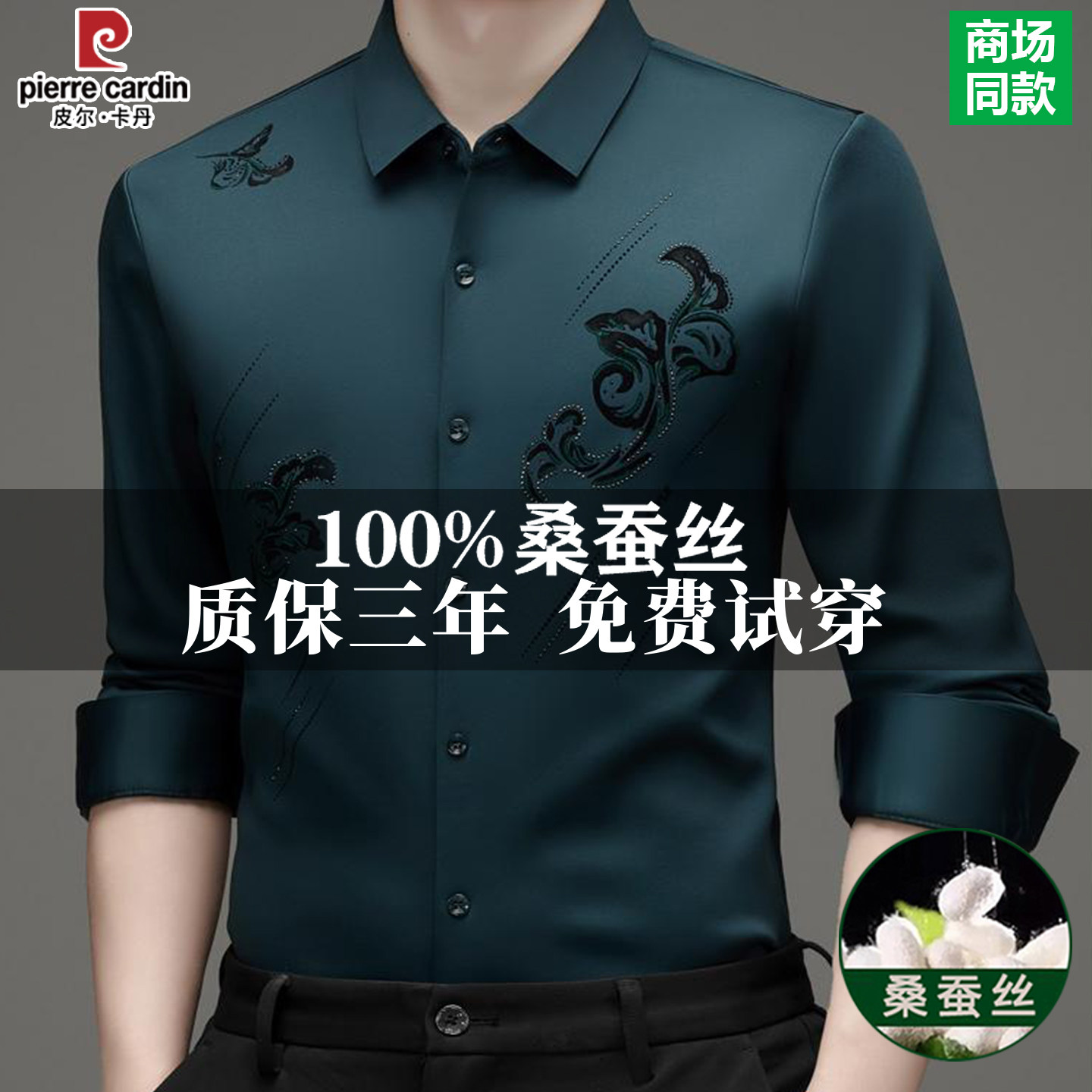 皮尔卡丹桑蚕丝男士长袖保暖衬衫加绒加厚高级感无痕免烫中年衬衣