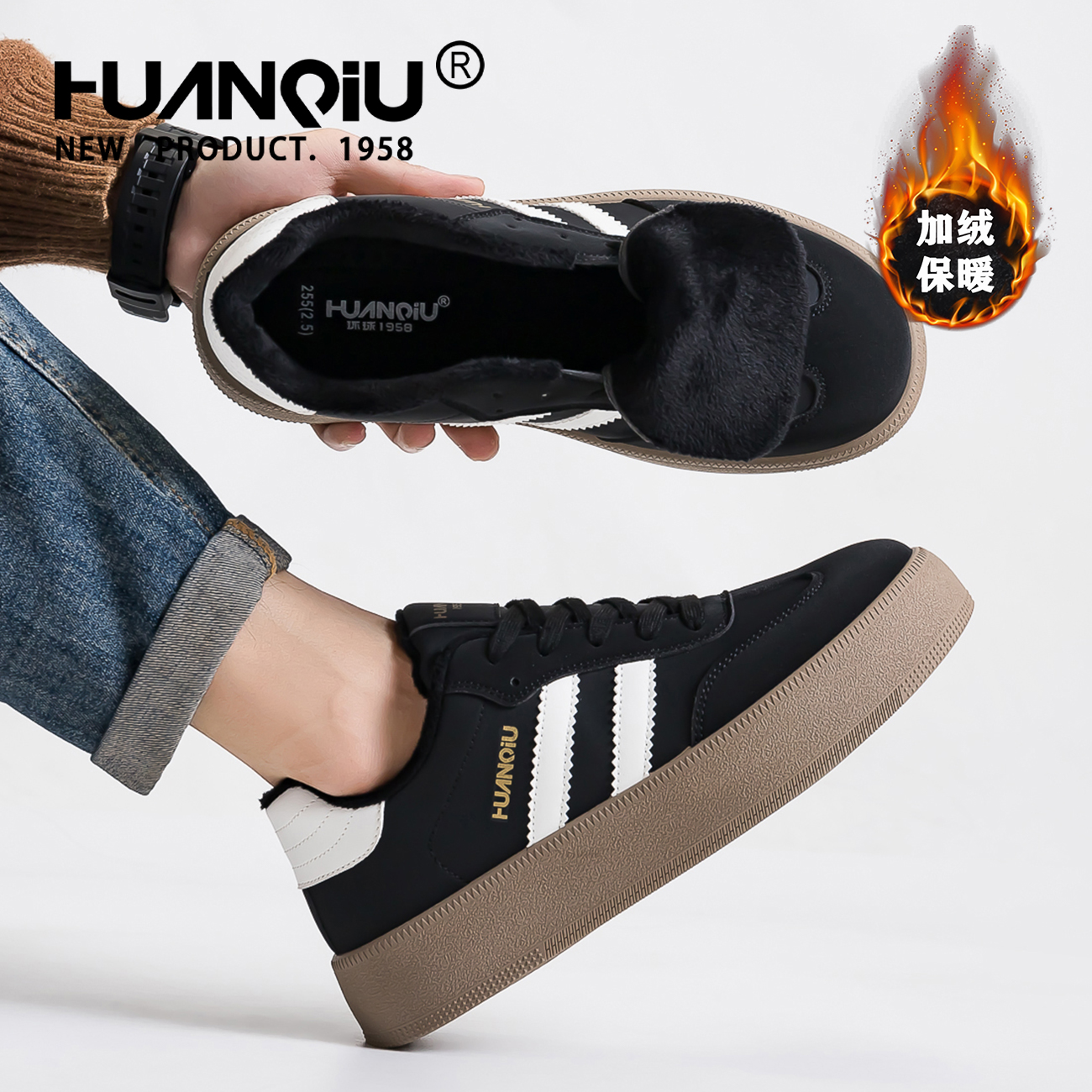 环球加绒小黑鞋男2025新款冬季厚底百搭黑色德训鞋潮流保暖二棉鞋