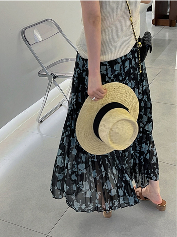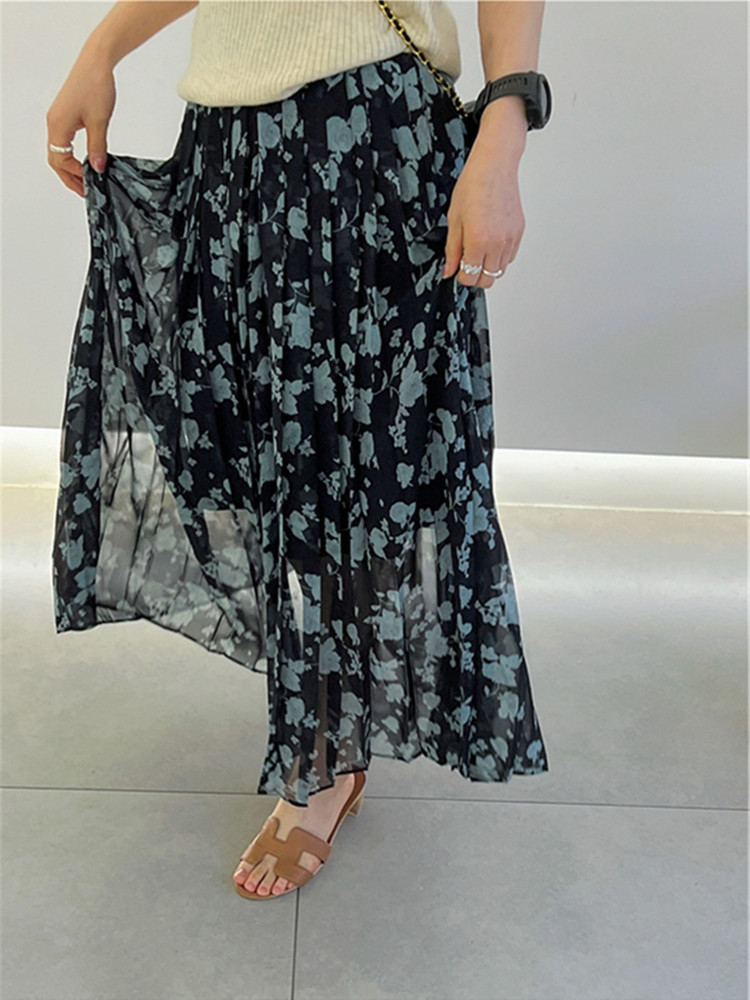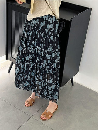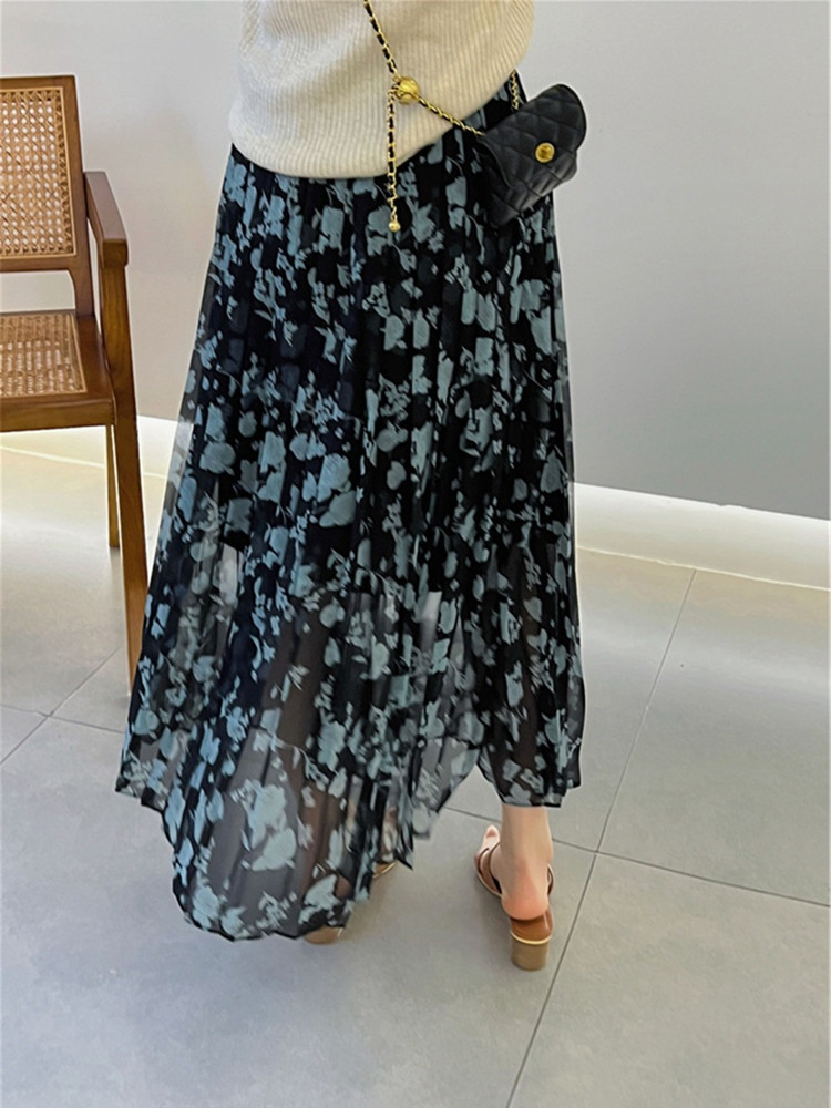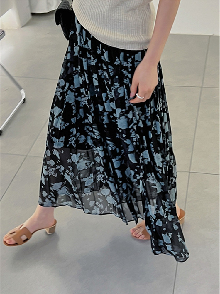 复古蓝色碎花半身裙女夏季中长款A字裙宽松垂坠感印花雪纺百褶裙