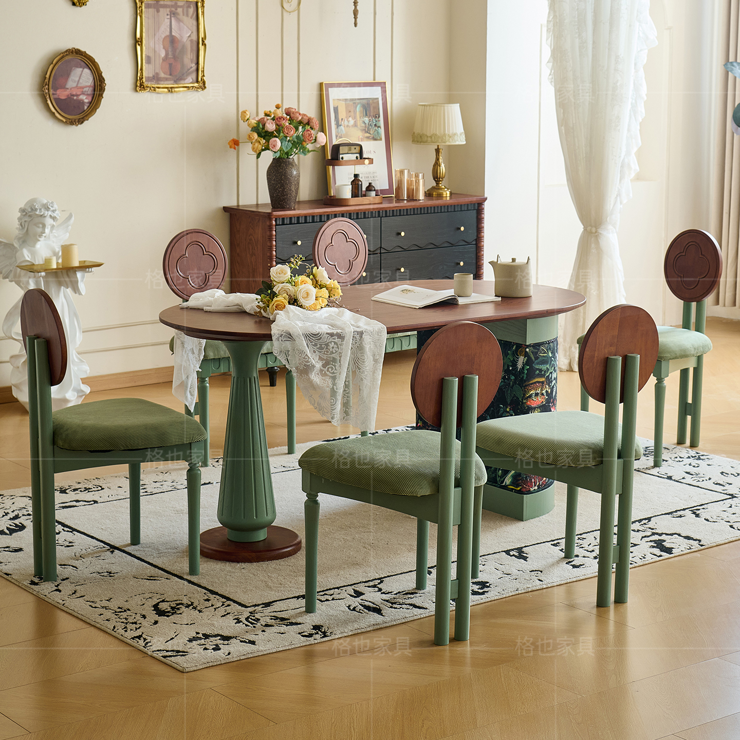 法式复古全实木绿色餐桌椅组合中古风家用小户型红橡木椭圆形饭桌