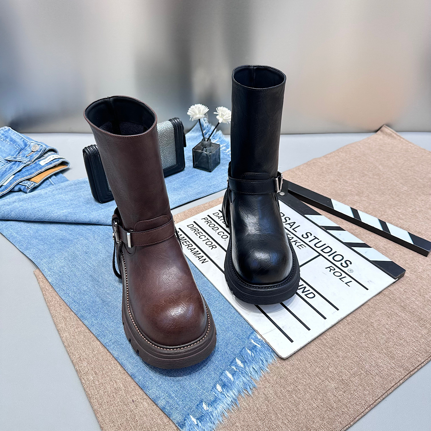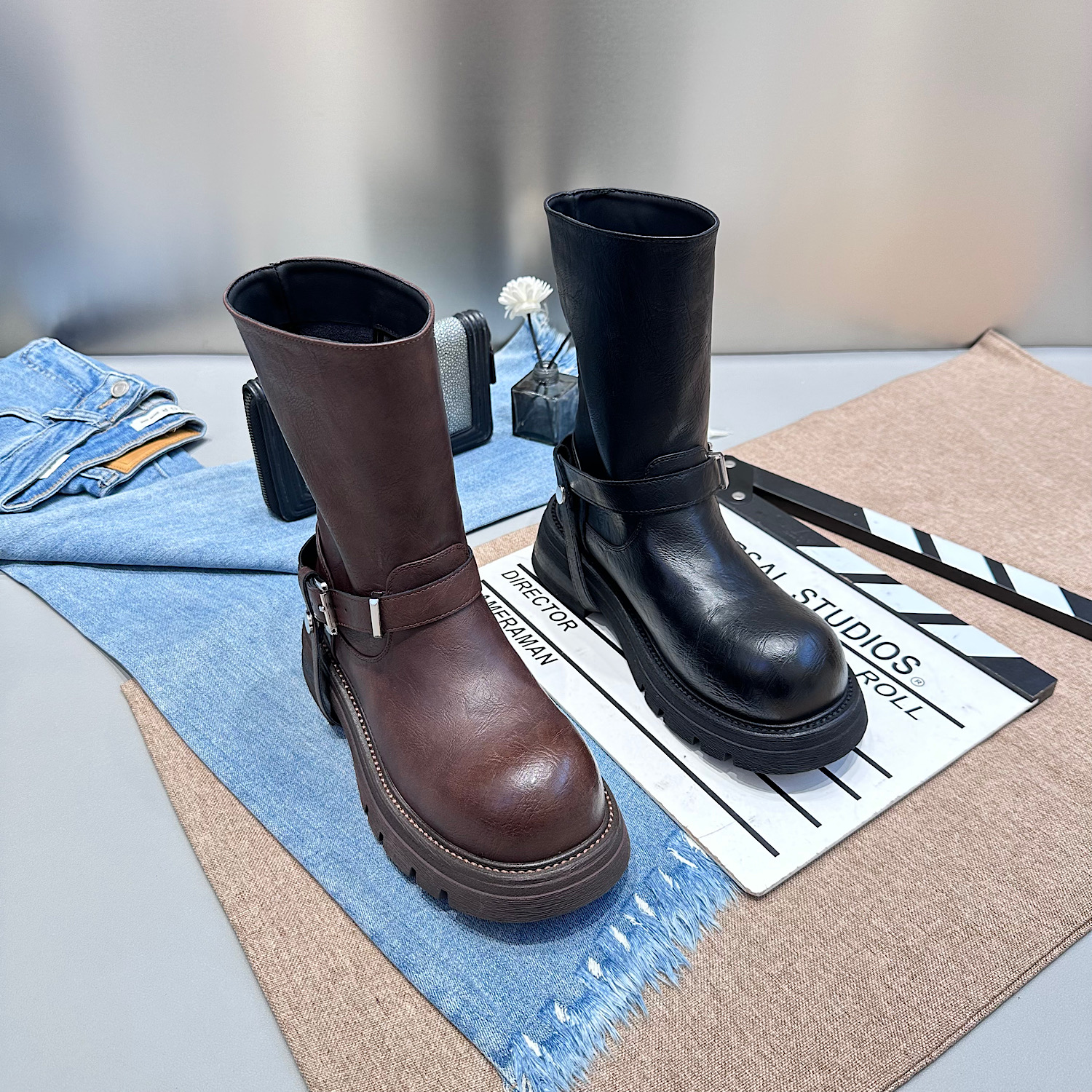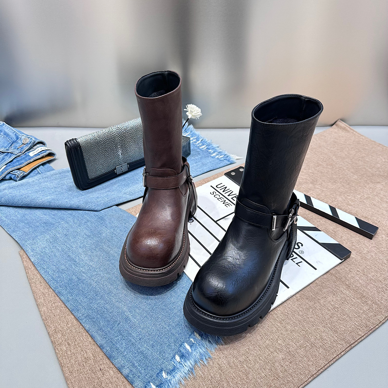 欧货2025秋冬新款圆头粗跟中筒靴复古女靴扣带骑士靴女靴子瘦瘦靴