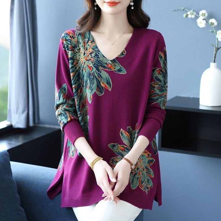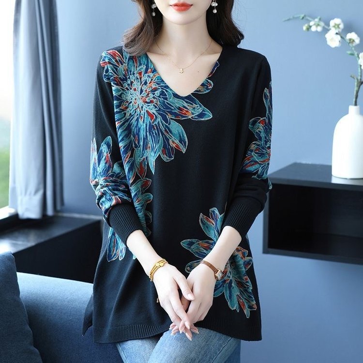 秋冬新款女宽松中长款时尚洋气针织衫v领遮肚子打底毛衣
