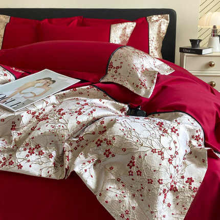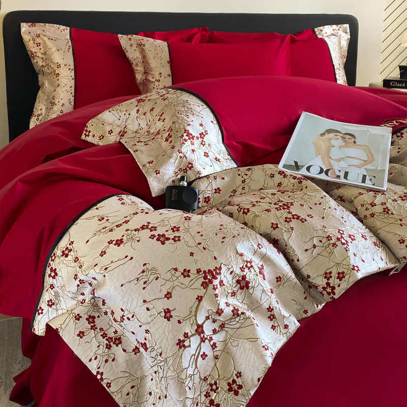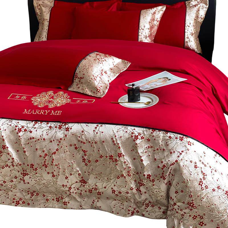 法式浪漫长绒棉纯棉婚庆四件套红色床单被套结婚床上用品婚房喜被
