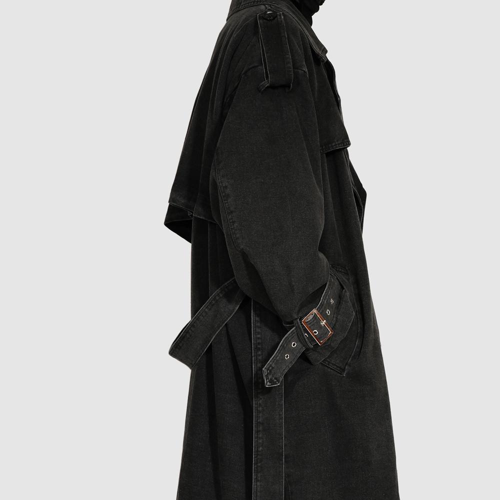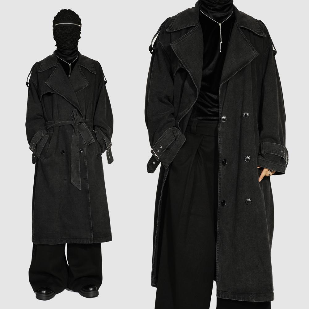 原创男装新款风衣男大码外套小众设计重工水洗牛仔双排扣长款风衣