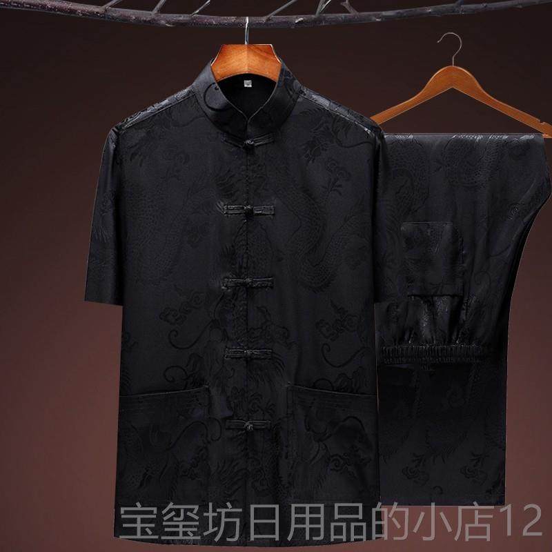 高档新中式夏装男中老年人季冰丝短袖龙衬衫套唐装纹爷爷装汉服太