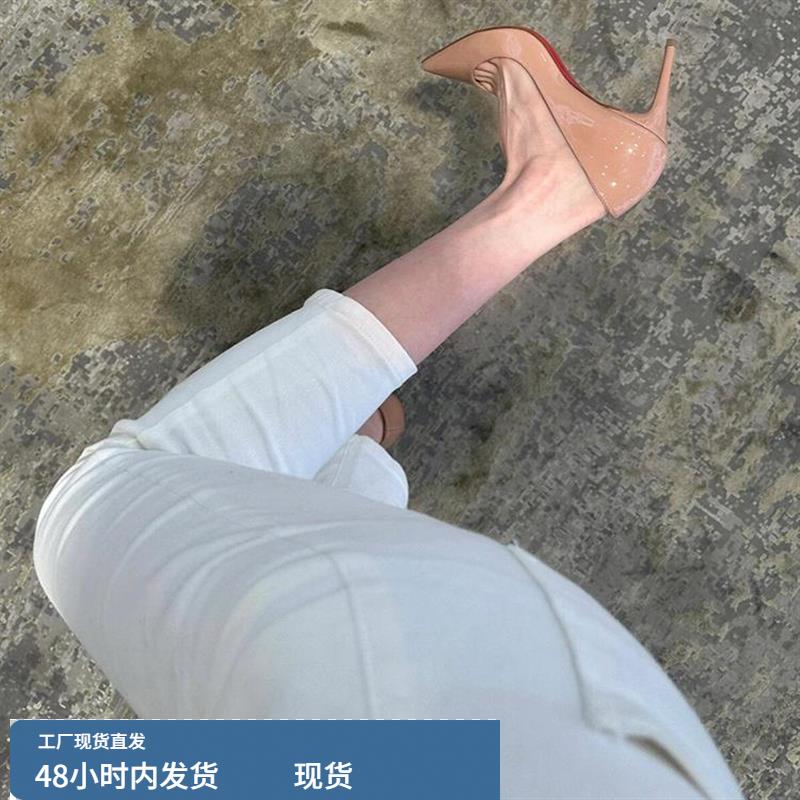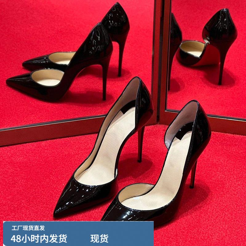新款尖头性感漆皮黑色侧空红底鞋女细跟高跟鞋上班面试职业单鞋子