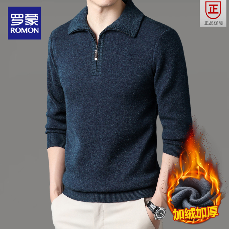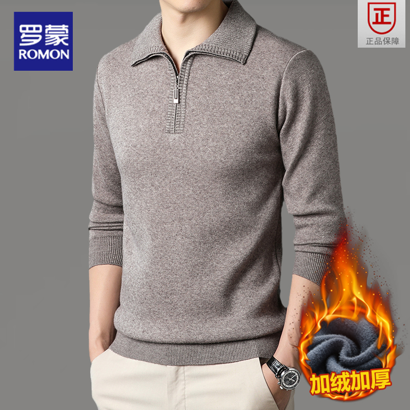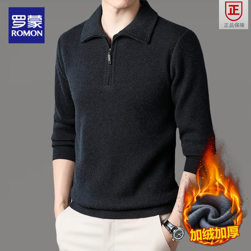 罗蒙秋冬季新款羊毛衫男半拉链立领毛衣加绒加厚保暖一体绒打底衫