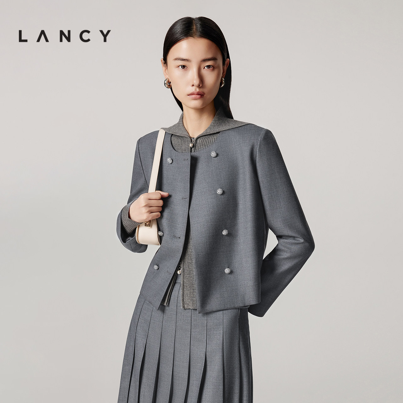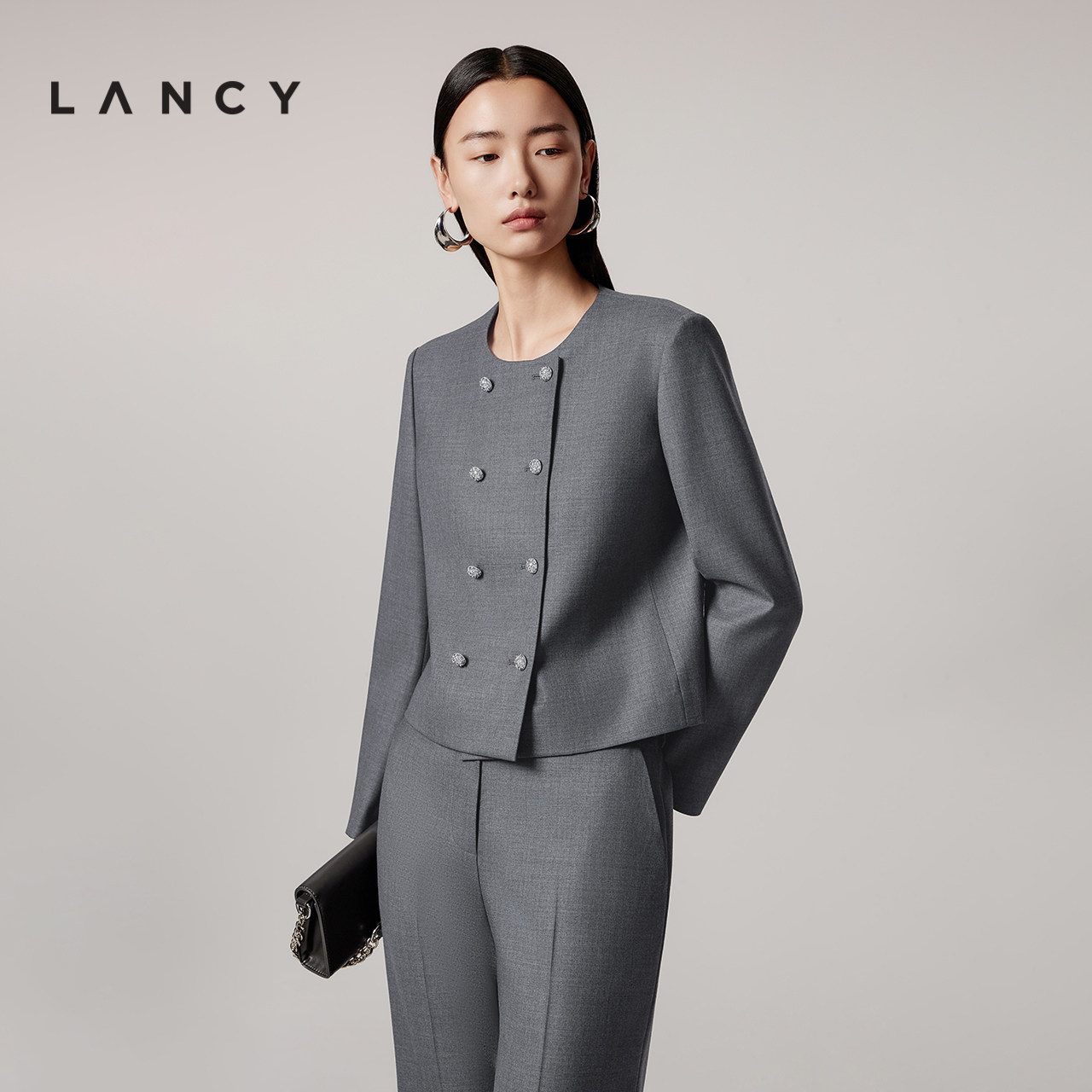 LANCY/朗姿2025年秋新款羊毛通勤职场圆领短外套女高级感气质上衣