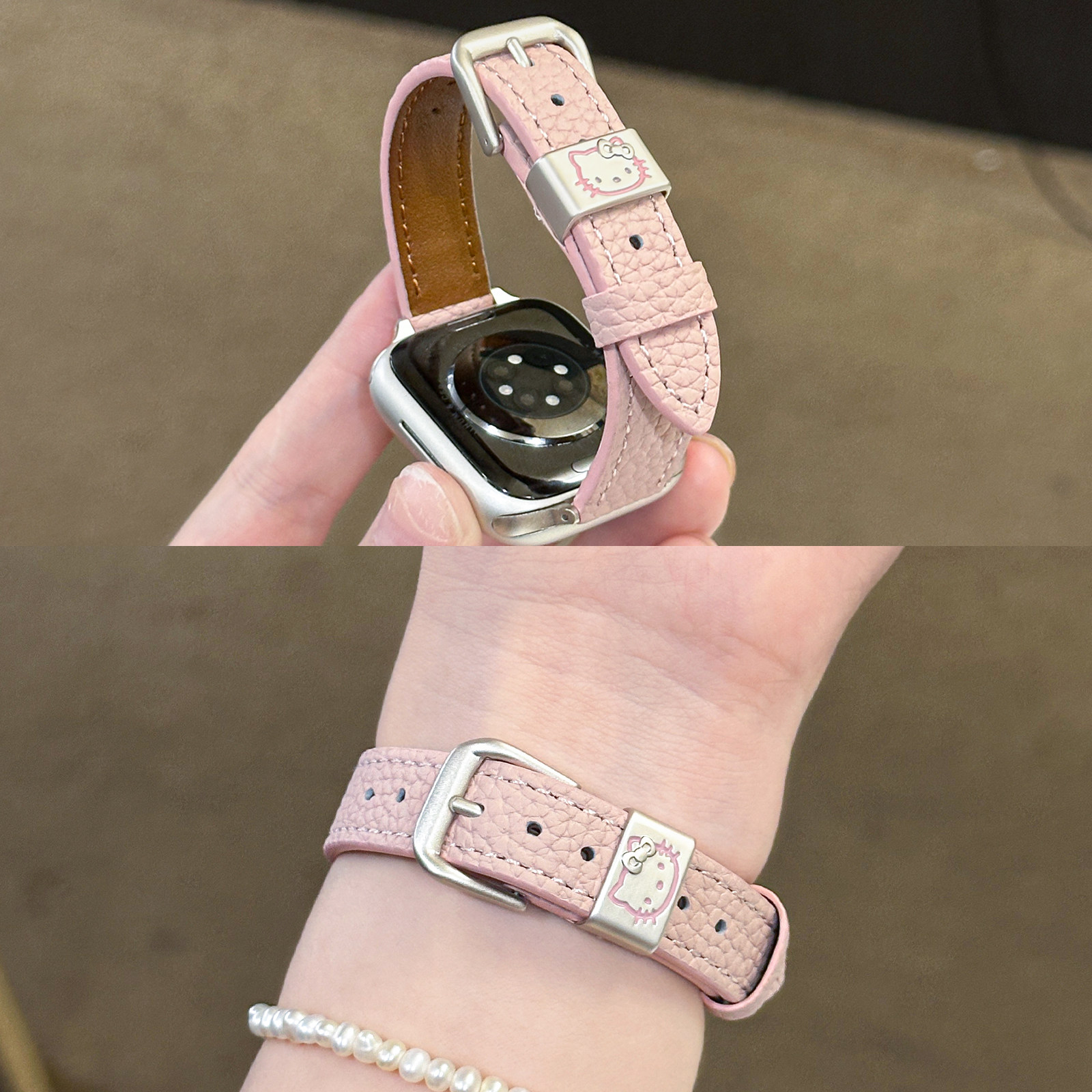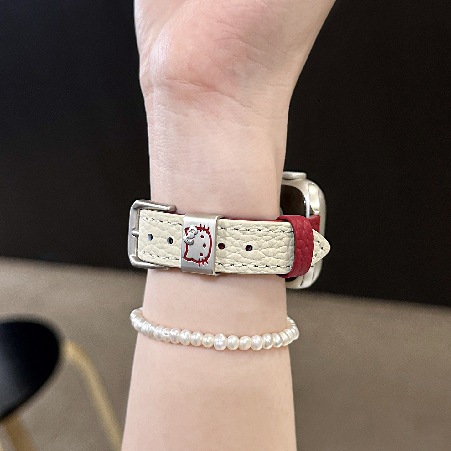 适用苹果手表拼色KT猫荔枝纹细款真皮表带质感金属扣iWatch11秋冬