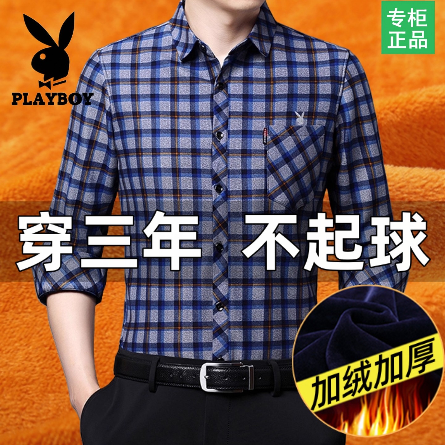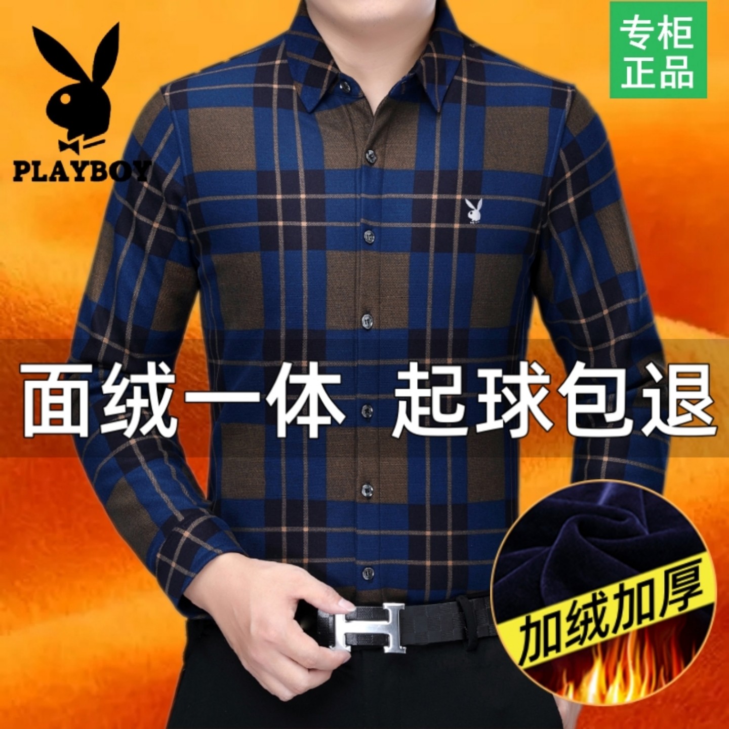 花花公子保暖衬衫男中年加绒加厚一体衬衣纯棉大码中老年父亲冬装