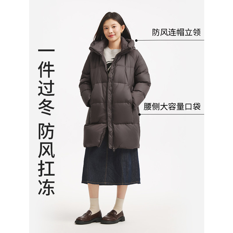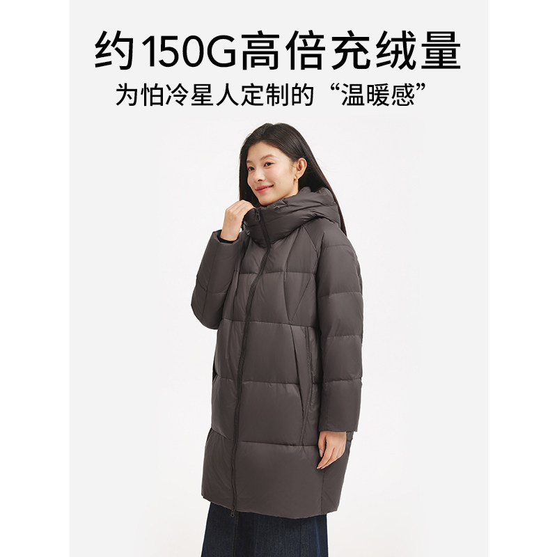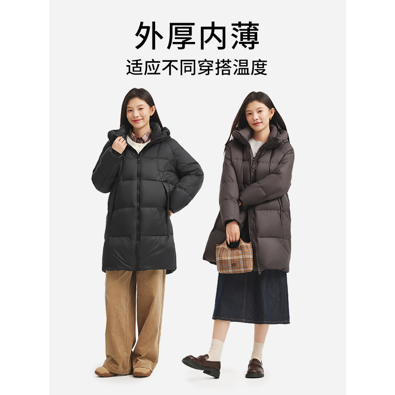 热风女士中长款羽绒服户外连帽2025年冬季新款极简风户外保暖外套