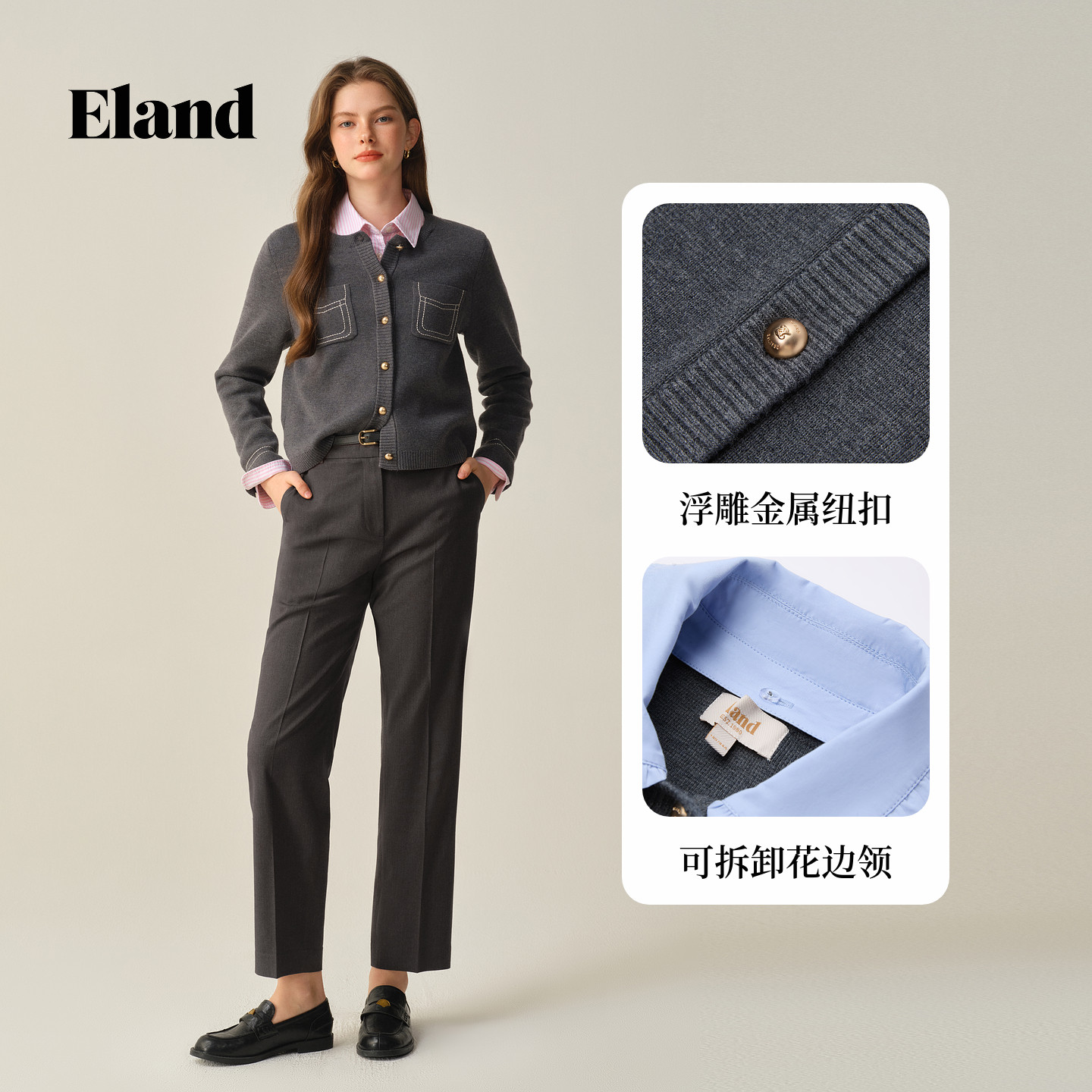 Eland衣恋毛针织衫女甜美娃娃领假两件短款开衫2025冬季新款