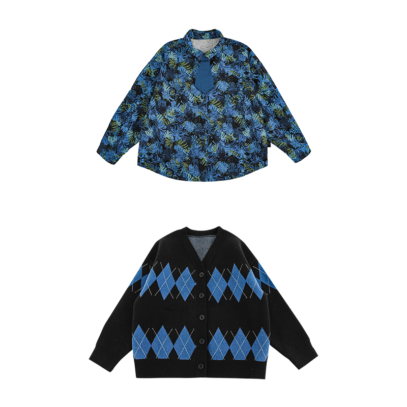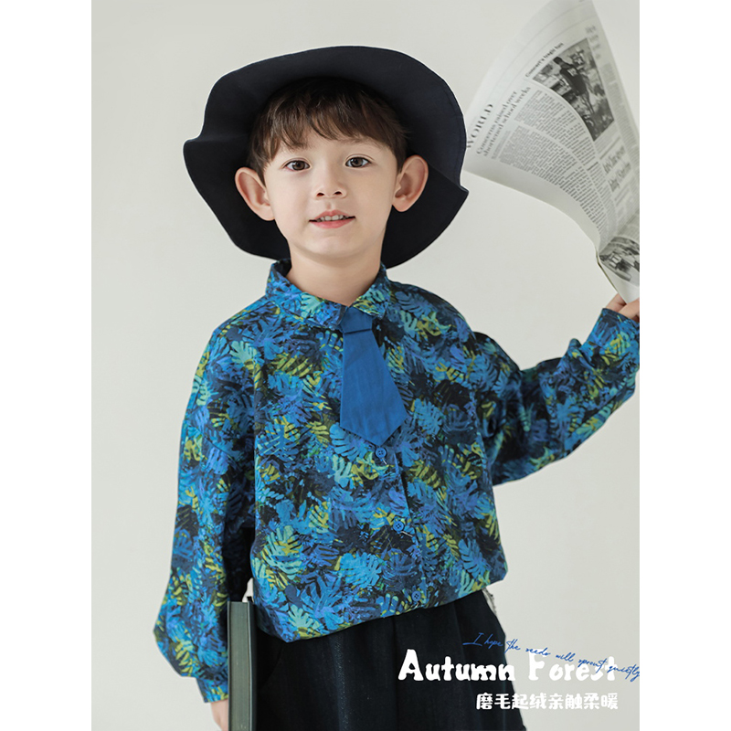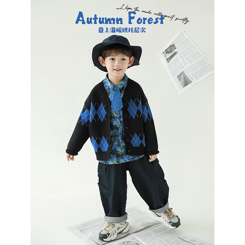 幼悠男童秋季长袖翻领简约蓝色衬衫2025新款菱形毛衣儿童秋装套装