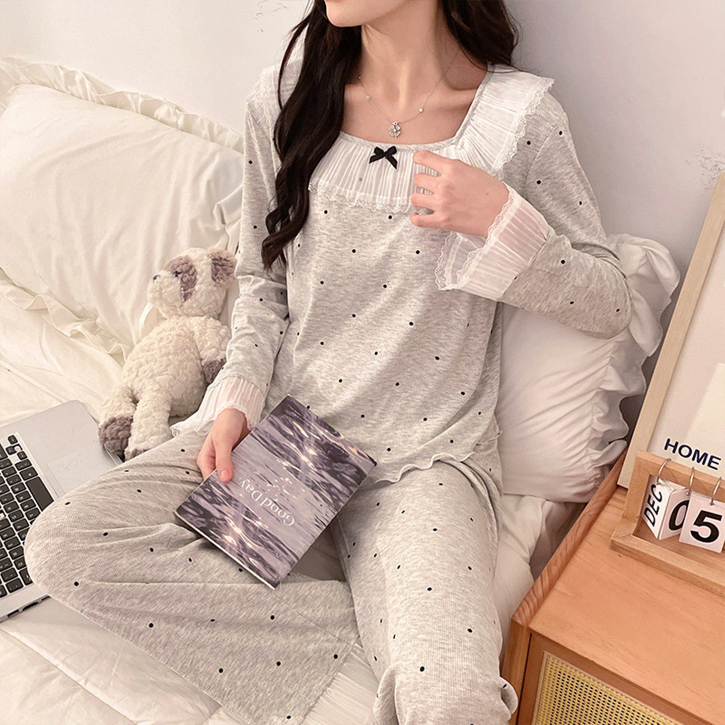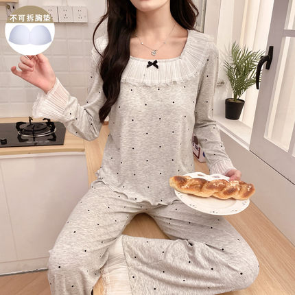 带胸垫睡衣女款春秋季莫代尔2026新款甜美波点蕾丝长袖套装家居服