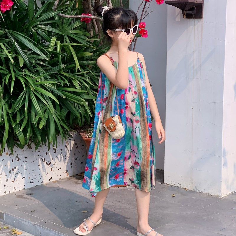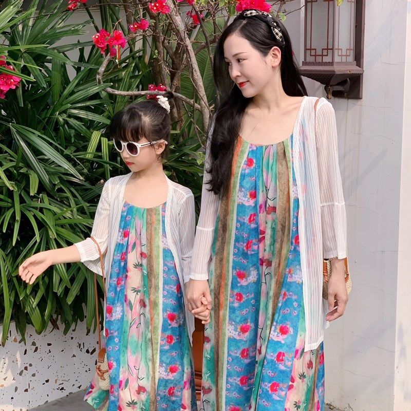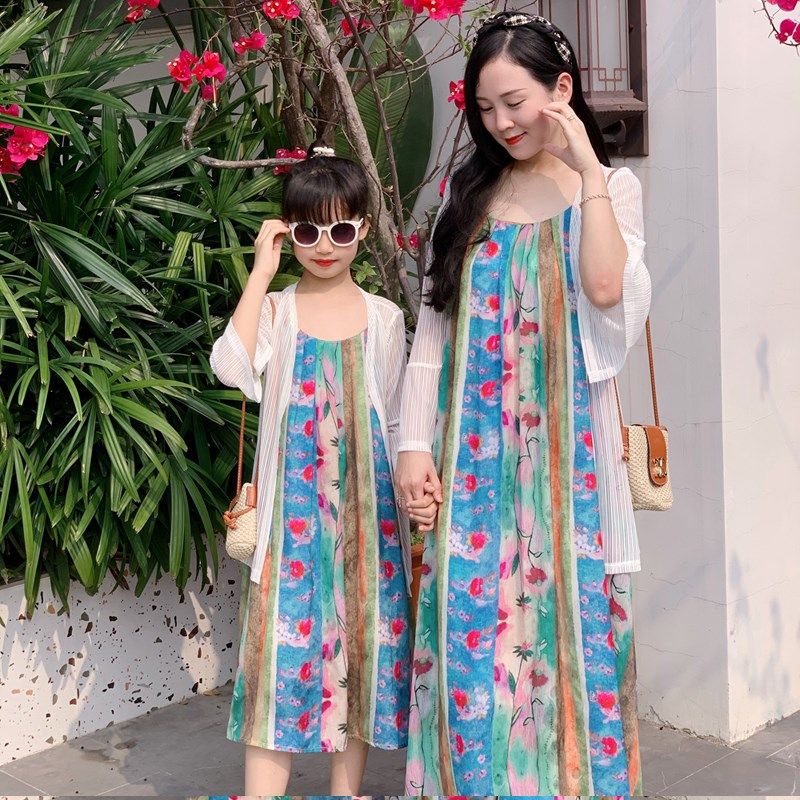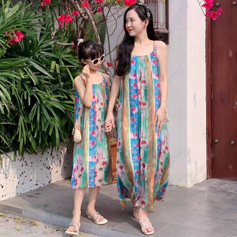 2024亲子装母女装夏装新款新中式碎花中长裙吊带连衣裙复古度假裙