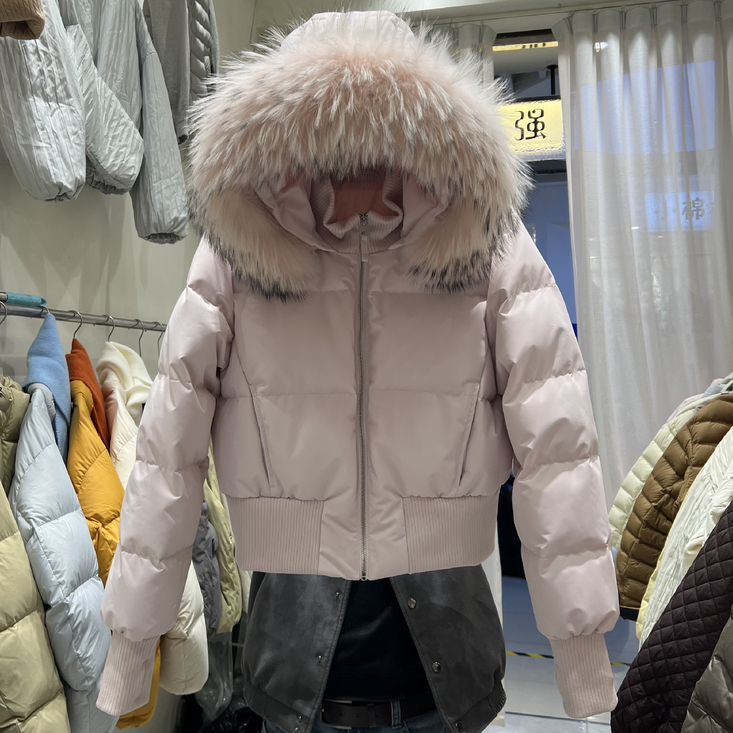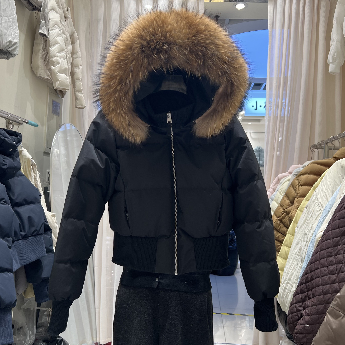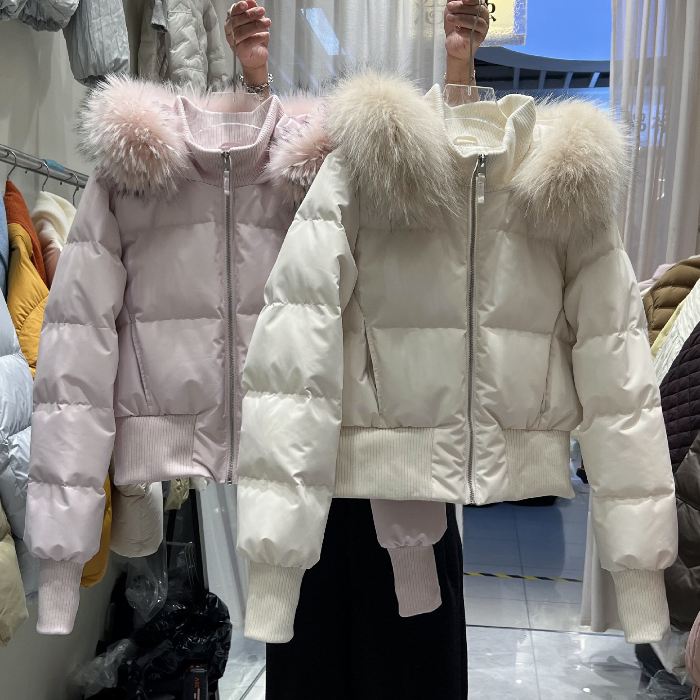 小个子收腰真大毛领藏青羽绒服女