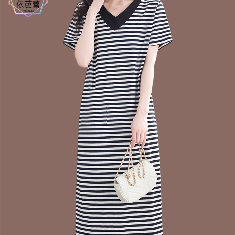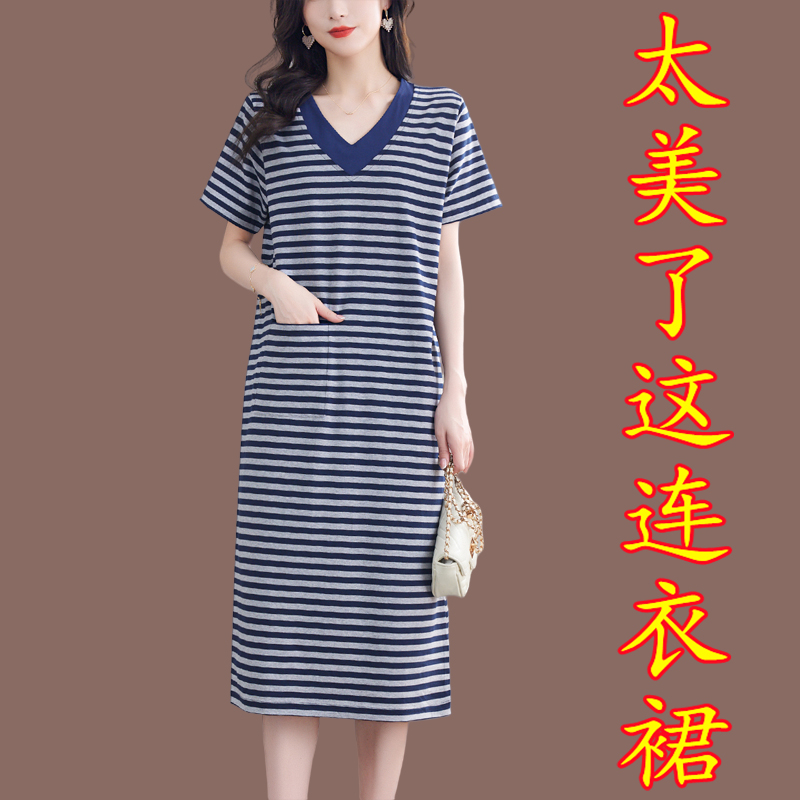 夏季纯棉绸连衣裙女宽松V领短袖t恤中年妈妈长款过膝针织条纹裙