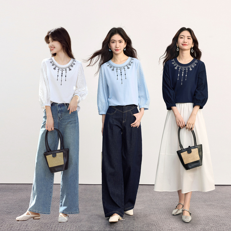 熙世界纯棉白色t恤女2025新款显瘦遮肉七分袖民族风刺绣大码上衣