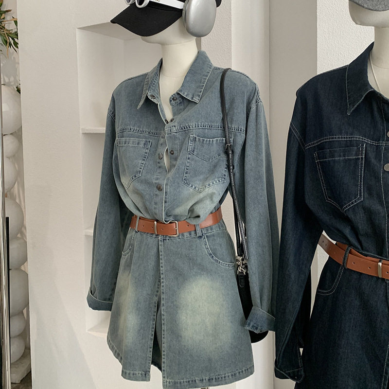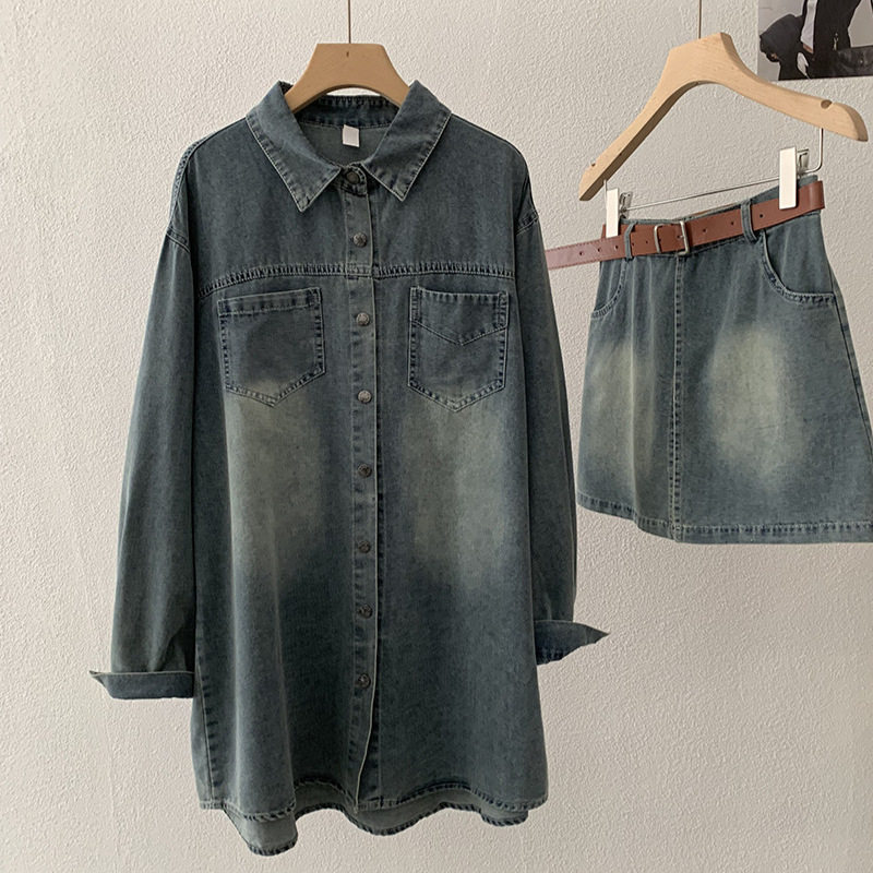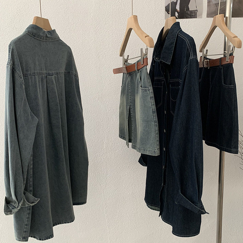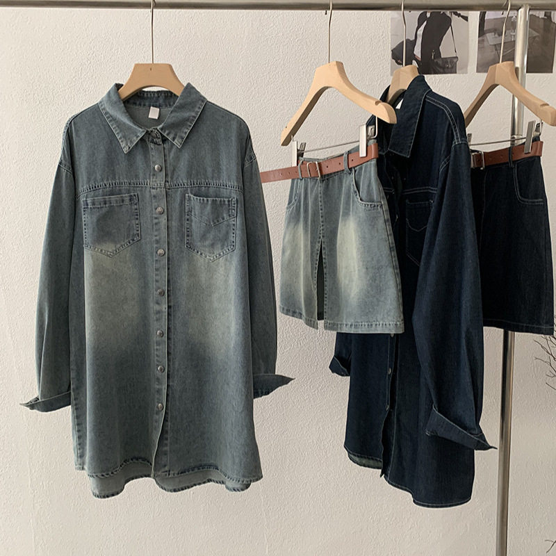 欧玛莱 2026春季新款韩版宽松中长款牛仔衬衫+屁帘两件套装女6100