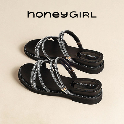 honeyGIRL水钻凉拖鞋女外穿2025新款夏季平底沙滩鞋俩穿海边拖鞋