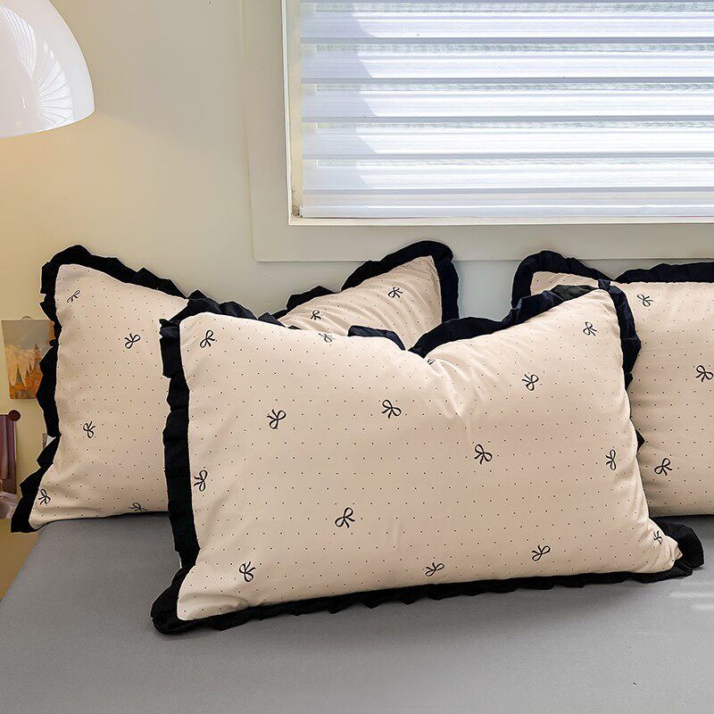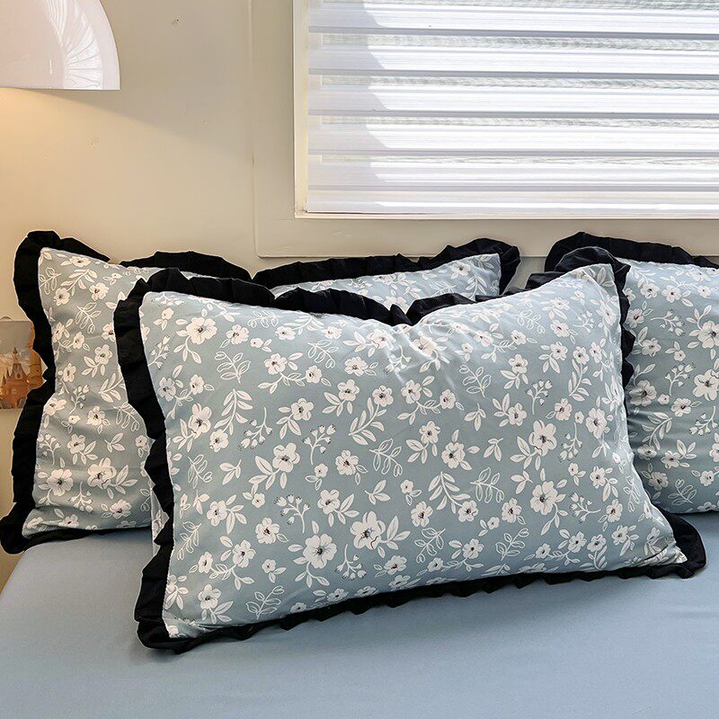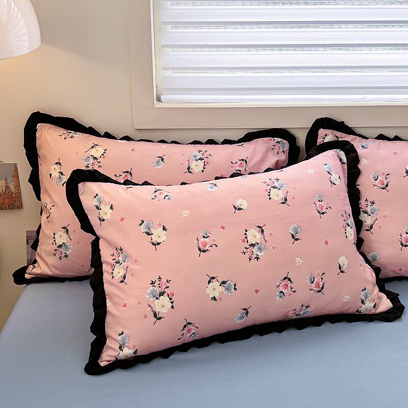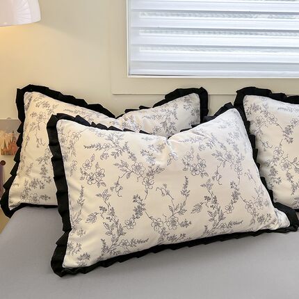 有氧水洗棉枕套一对赫本风法式黑色花边成人枕芯套2只装