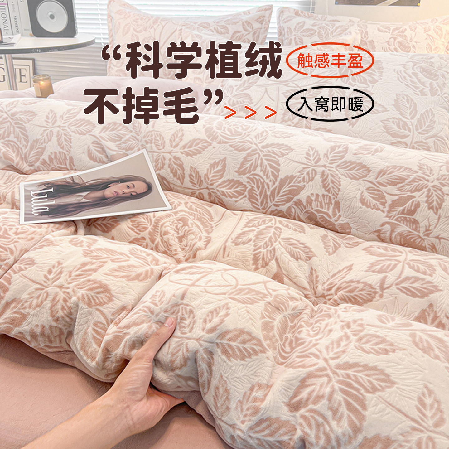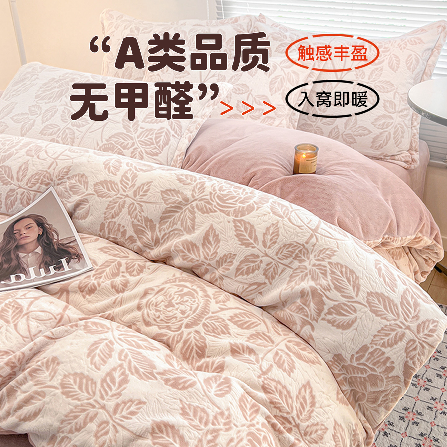红豆加厚雕花牛奶绒四件套2025新款珊瑚绒冬季法兰绒床单被套床上