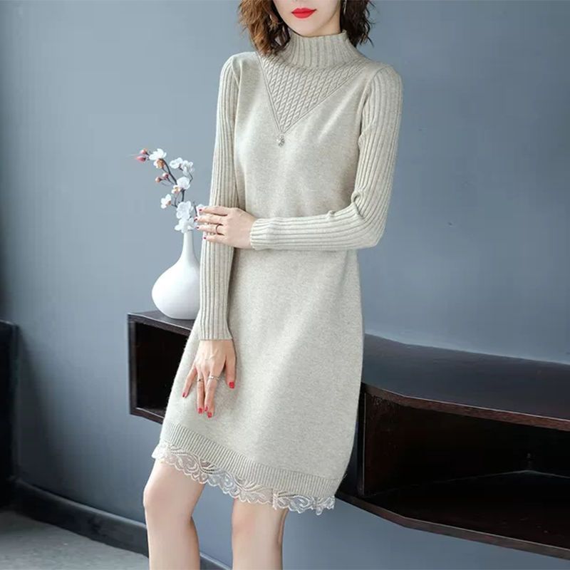 半高领针织连衣裙女士中长款毛衣2023秋冬新款蕾丝内搭上衣打底衫