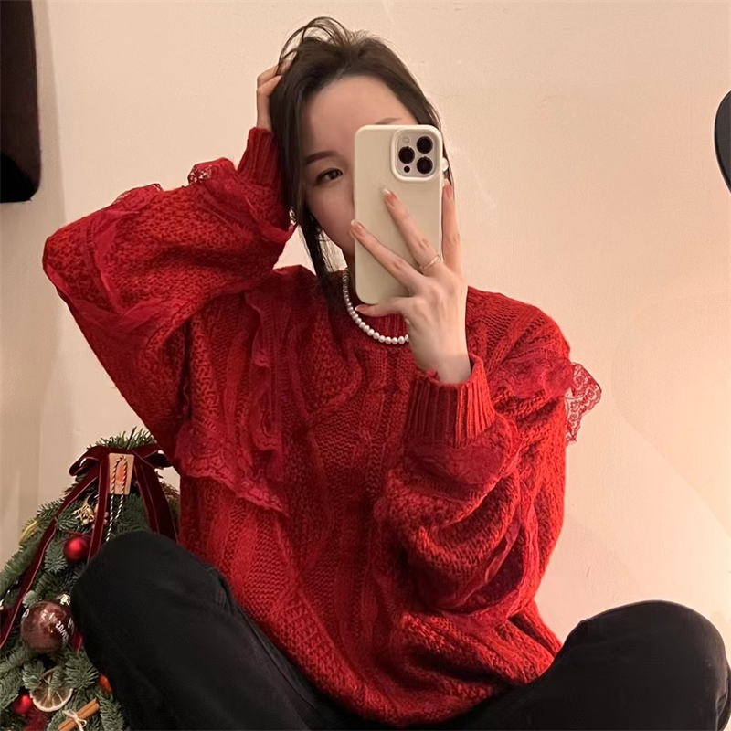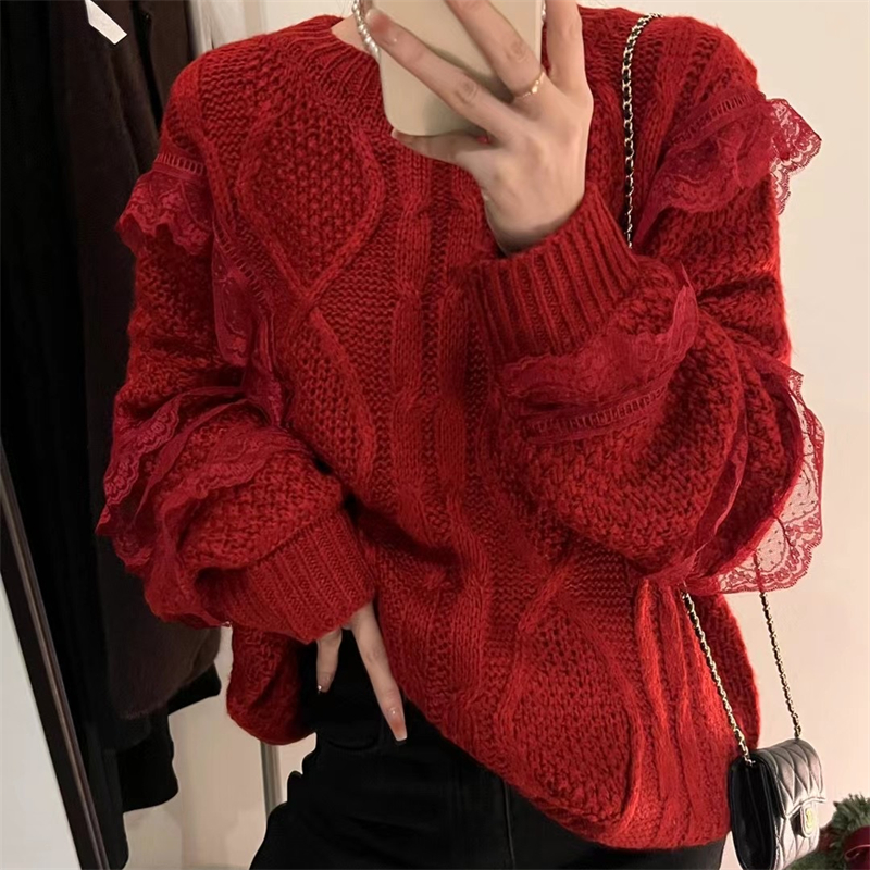 秋冬爆款复古麻花外穿针织衫蕾丝拼接毛衣女套头韩版宽松学生短款