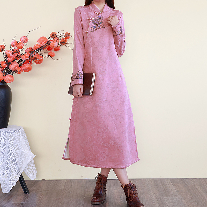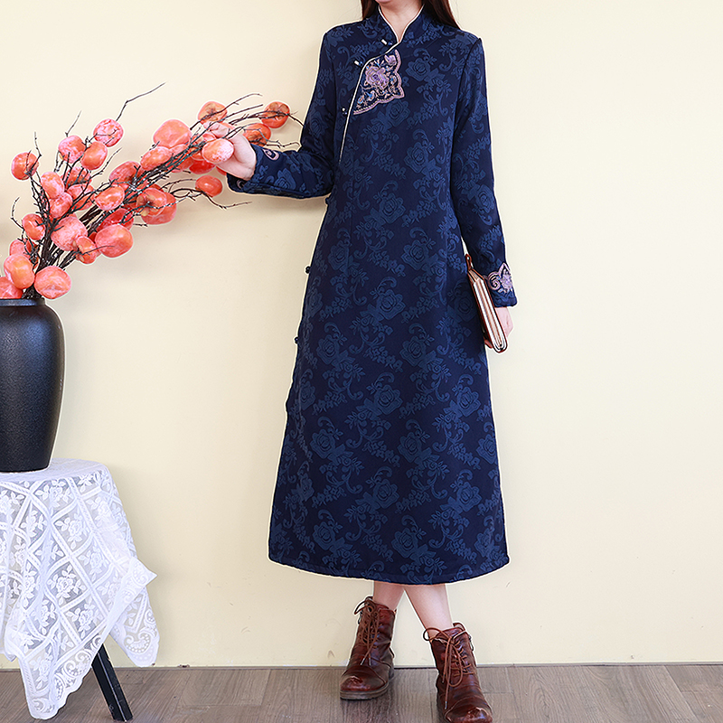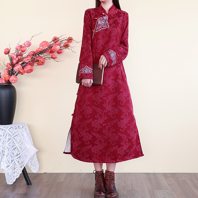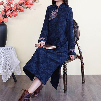 民族风旗袍裙棉麻加绒提花刺绣