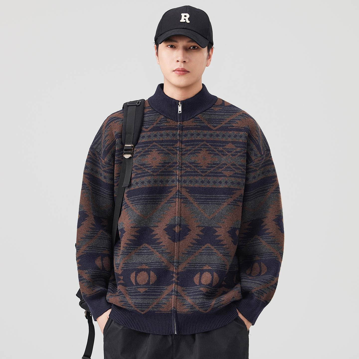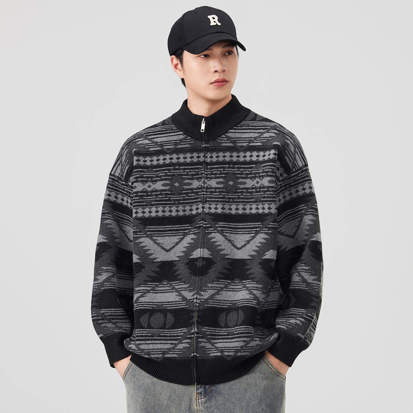 以纯秋冬季提花拉链开衫外套男针织衫立领宽松日系百搭毛衣潮