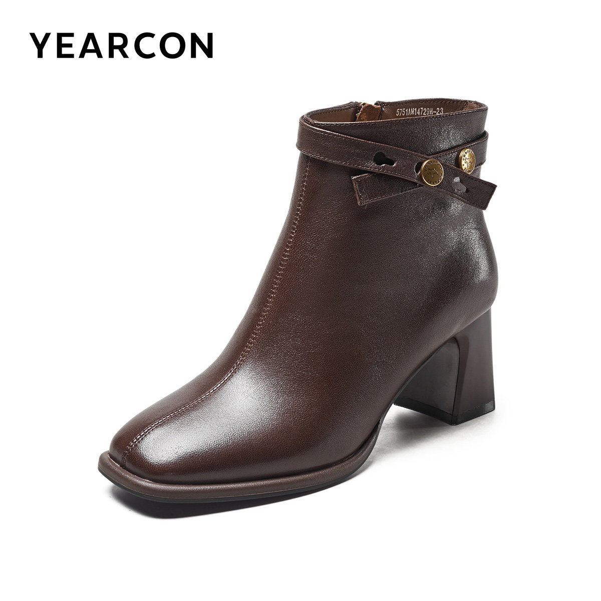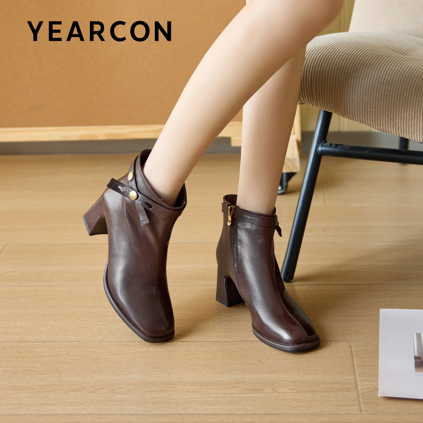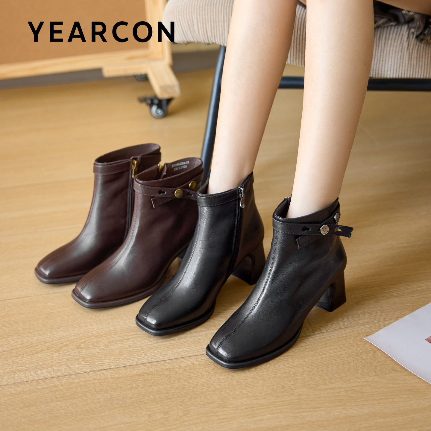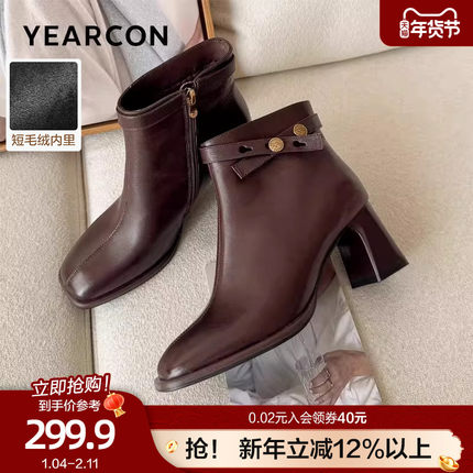 意尔康羊皮瘦瘦靴女2025秋冬款法式气质高跟短靴粗跟时装单靴真皮