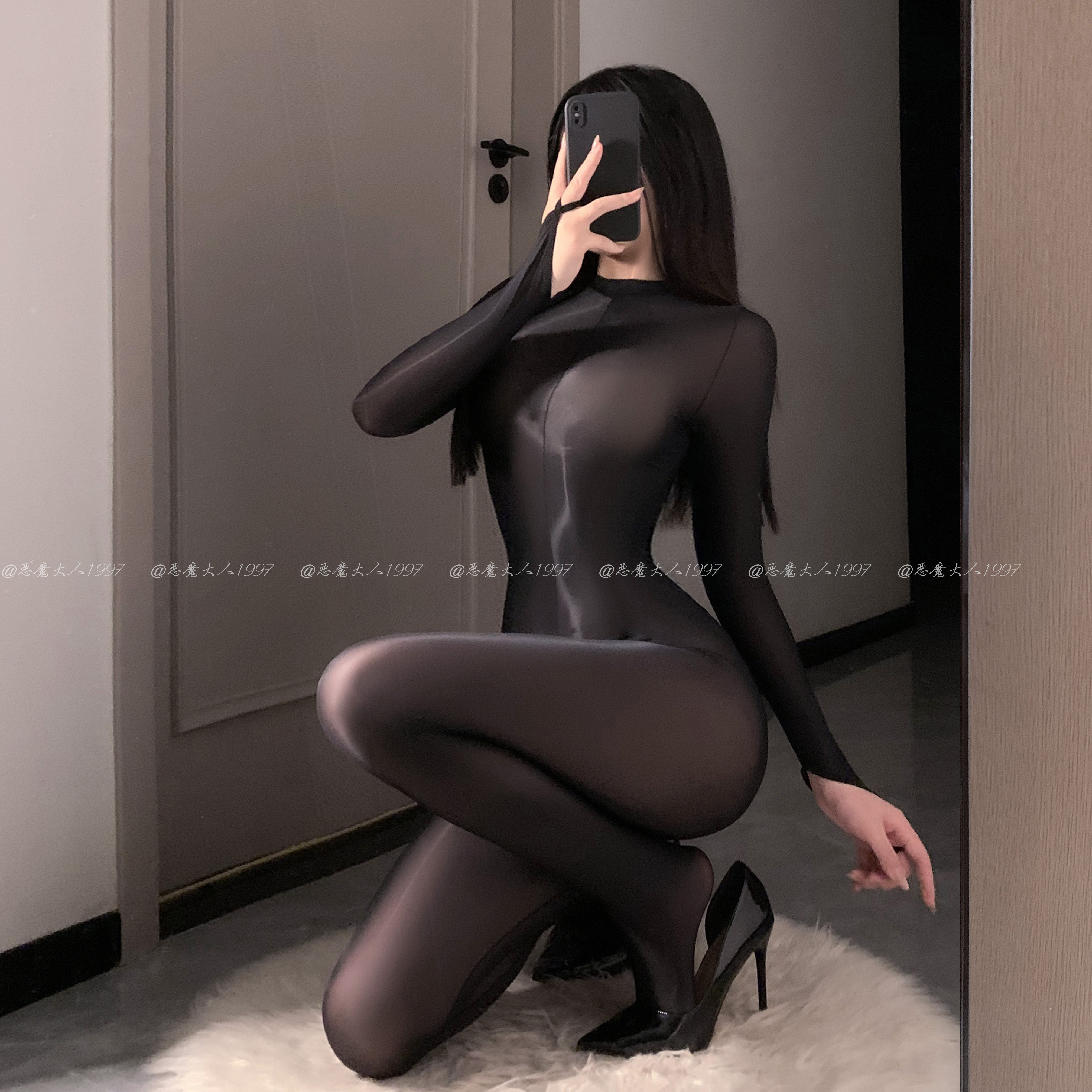 恶魔大人超薄面膜料1D油亮丝滑连体衣性感情趣紧身黑丝开档袜黑丝