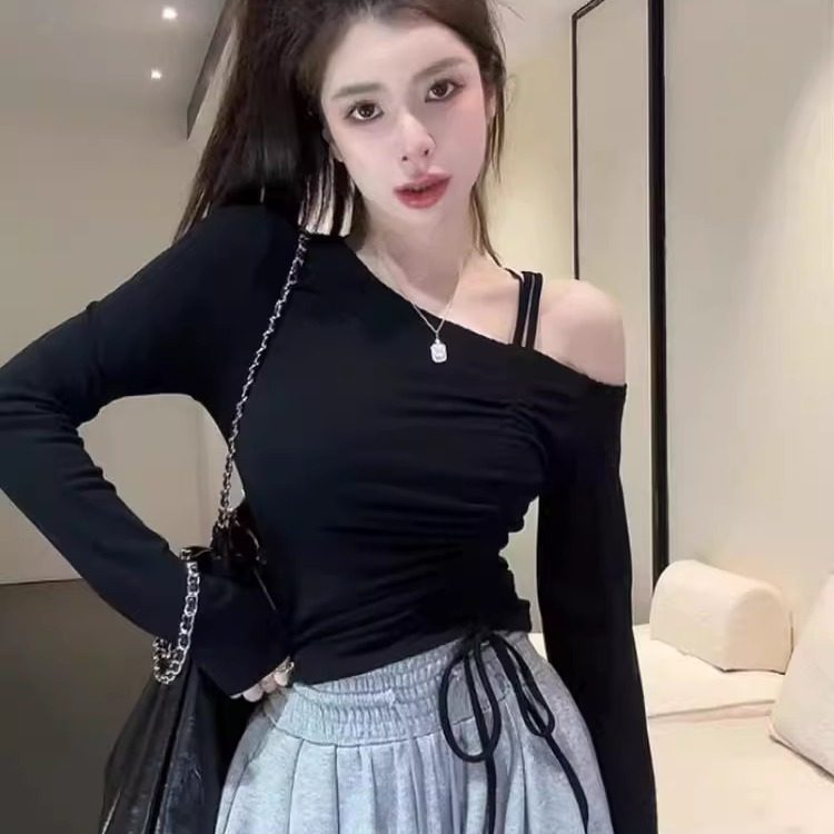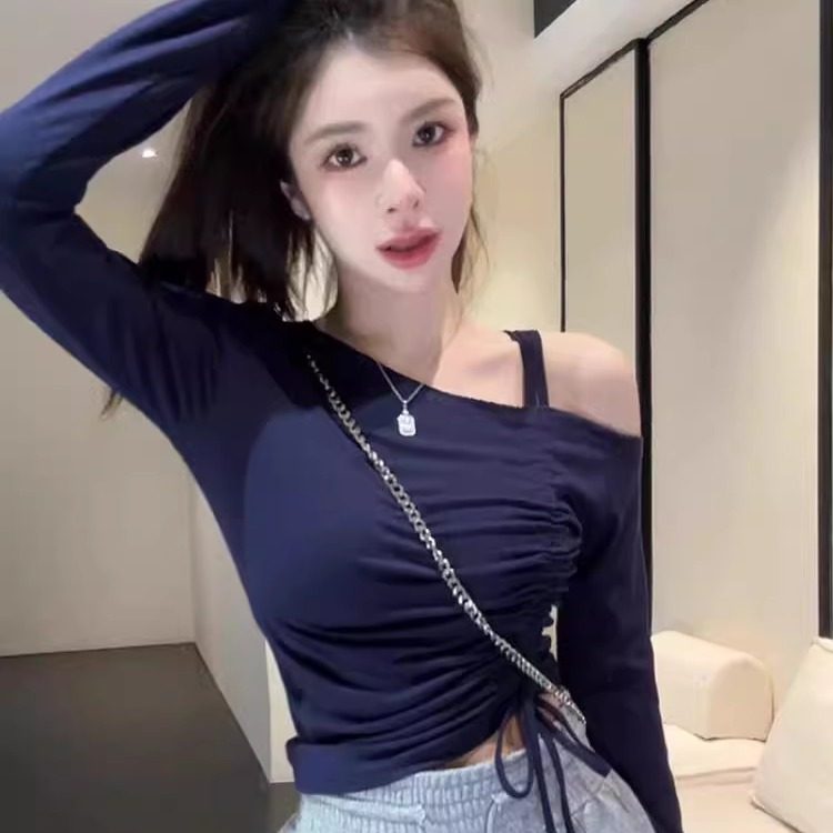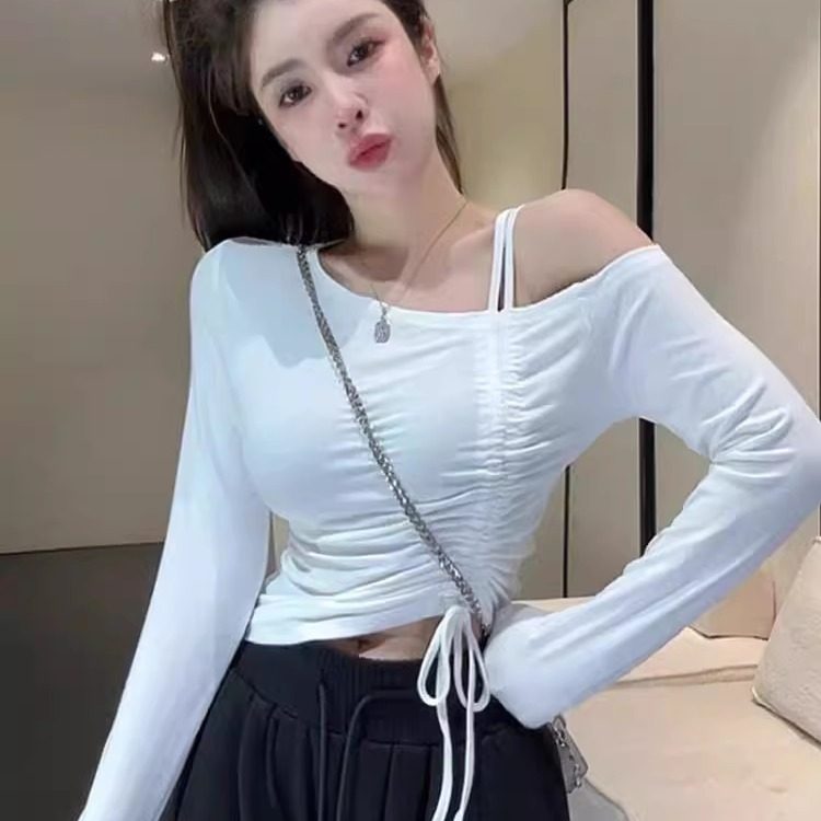 纯欲辣妹斜肩露肩打底衫女短款长袖t恤法式紧身收皱抽绳绑带上衣