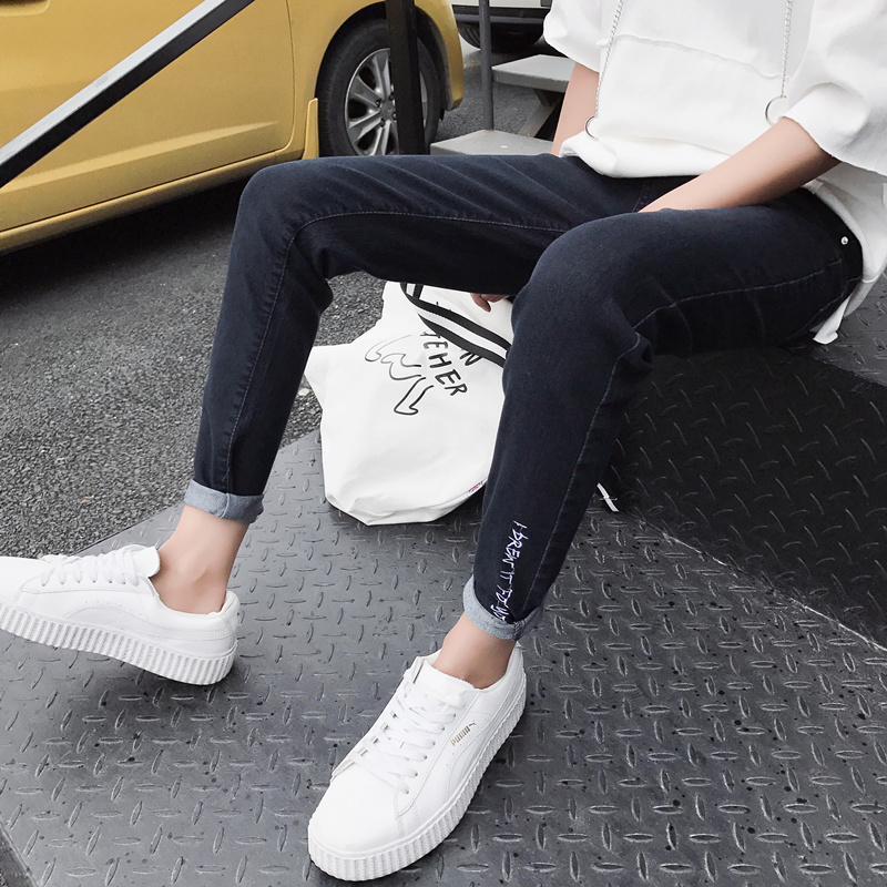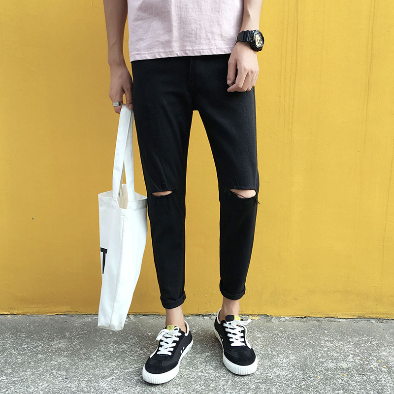 潮流黑色九分牛仔裤男士韩版修身小脚学生春秋新款2019百搭长裤子