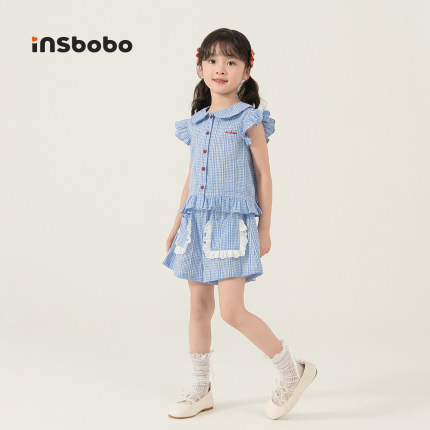 INSbobo女童夏套装儿童衣服夏季衬衫短裤女孩夏装时髦洋气格子衫