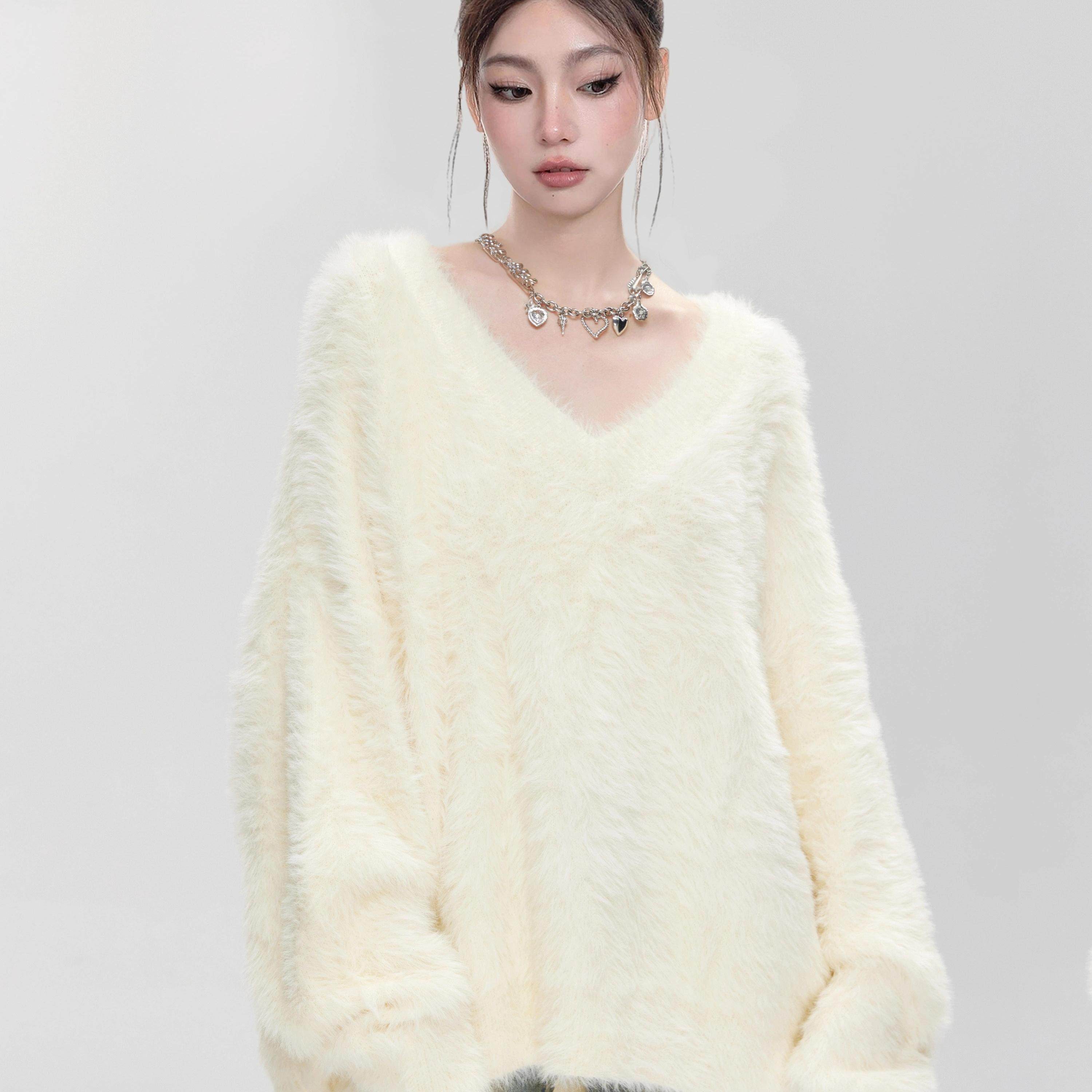 奶fufu白色水貂绒V领套头毛衣女春秋季内搭软糯慵懒马海毛针织衫