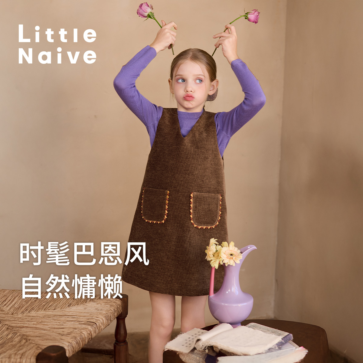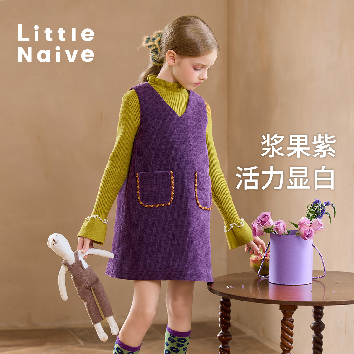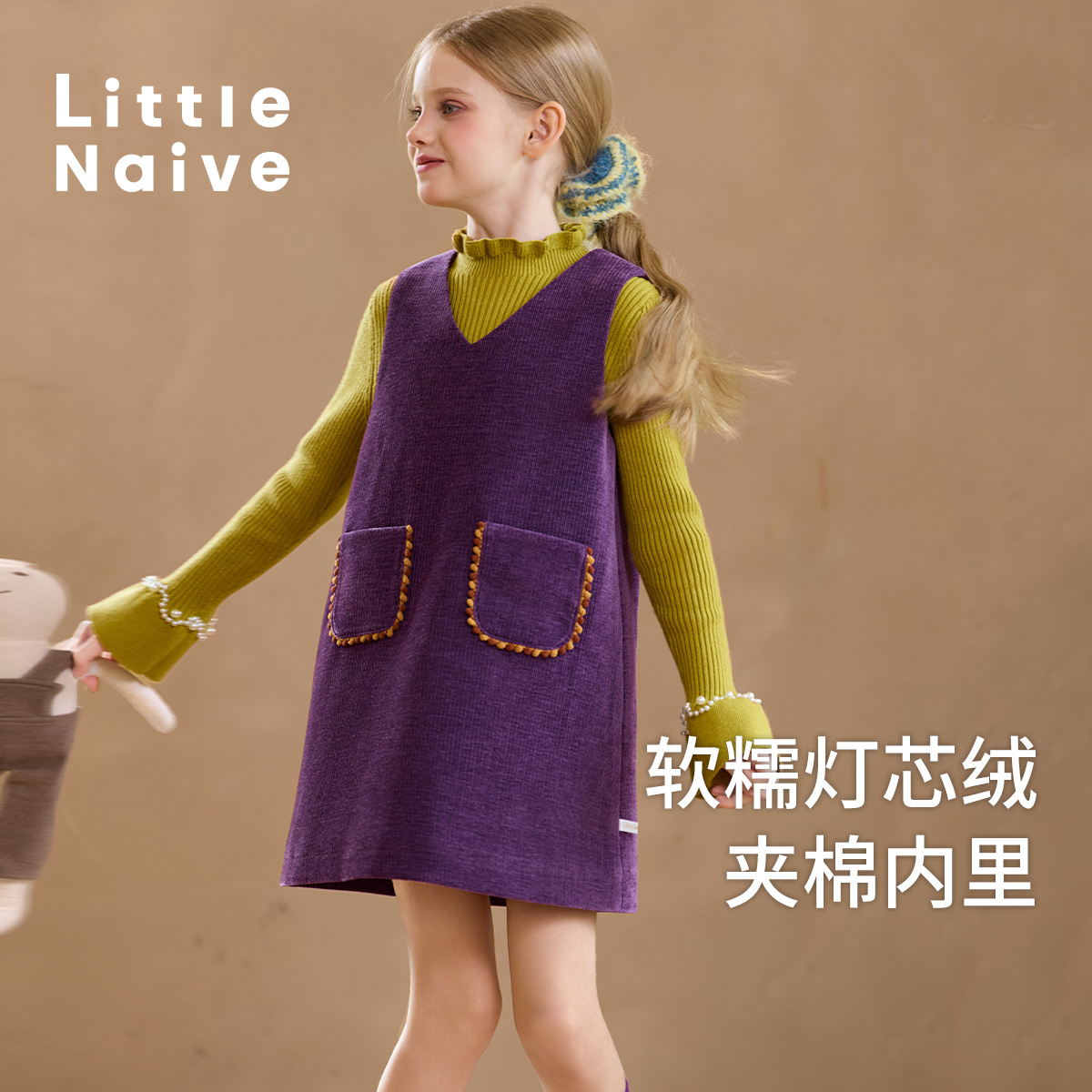 Little Naive儿童灯芯绒背带裙春秋款紫色夹棉裙子女童气质背心裙