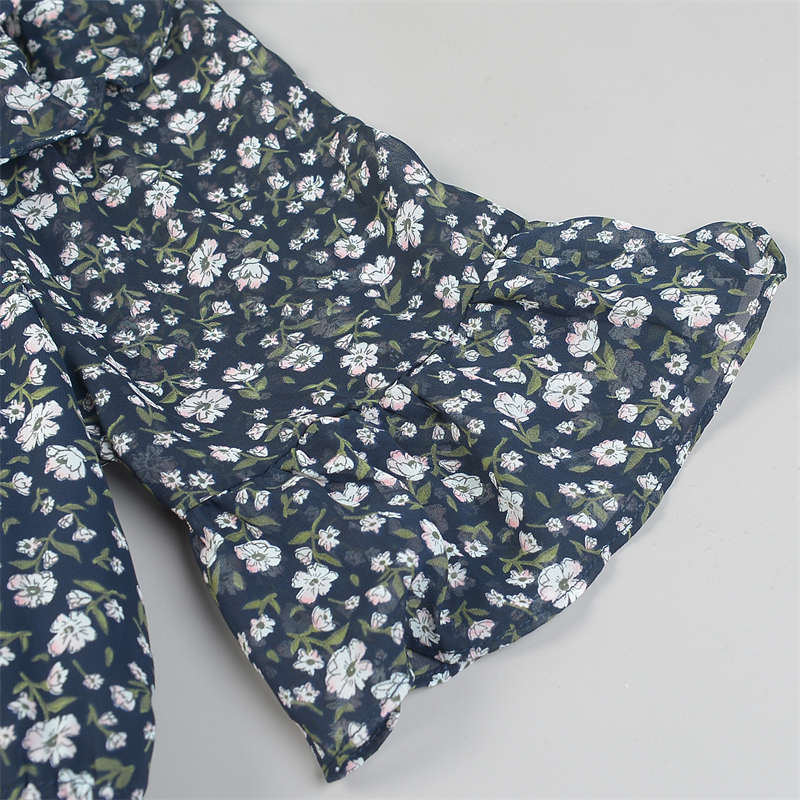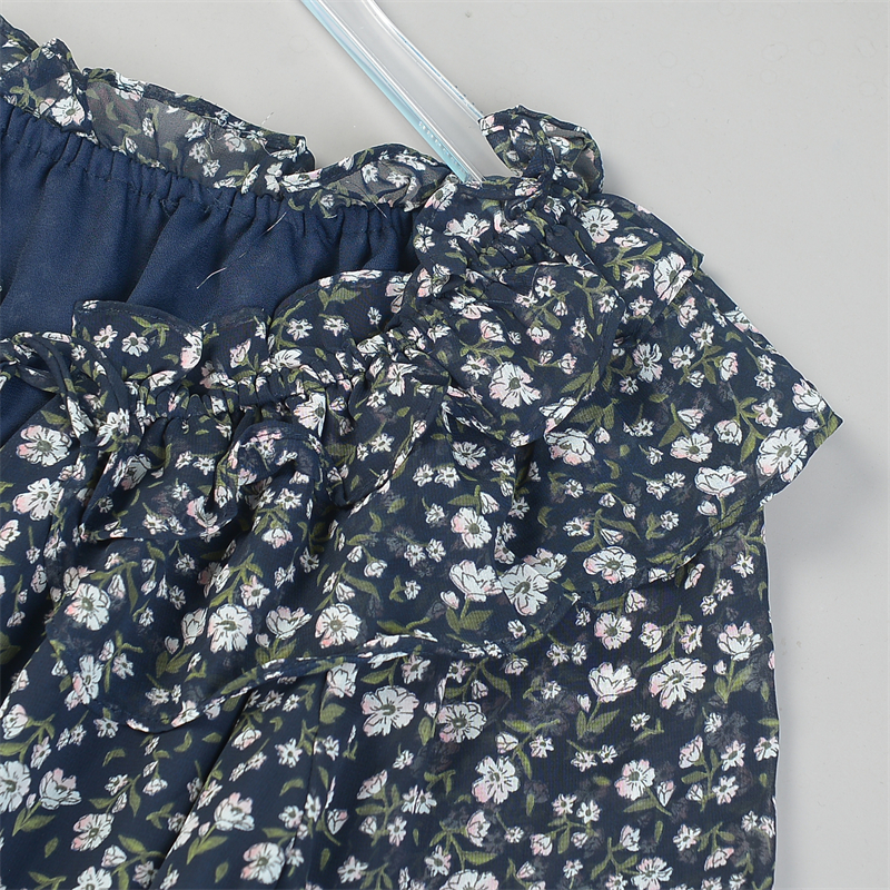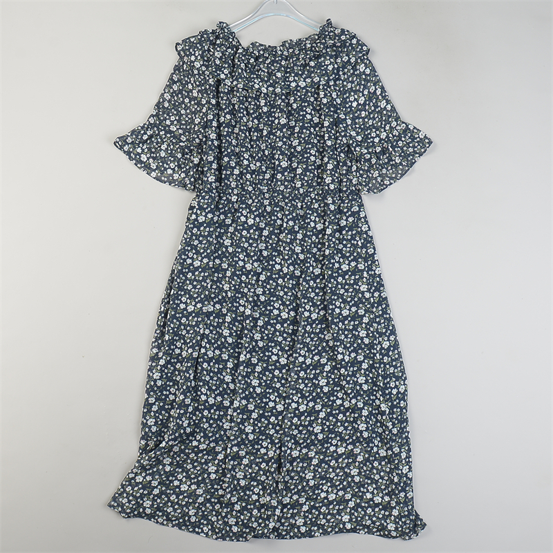 清甜碎花雪纺连衣裙女84929夏秋木耳边一字领高腰宽松A字中长裙子