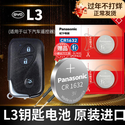 适用于比亚迪L3汽车钥匙电池原装CR1632原厂遥控器2025松下3V纽扣电子2012 2013 2015款轿车中控 圆形锁匙