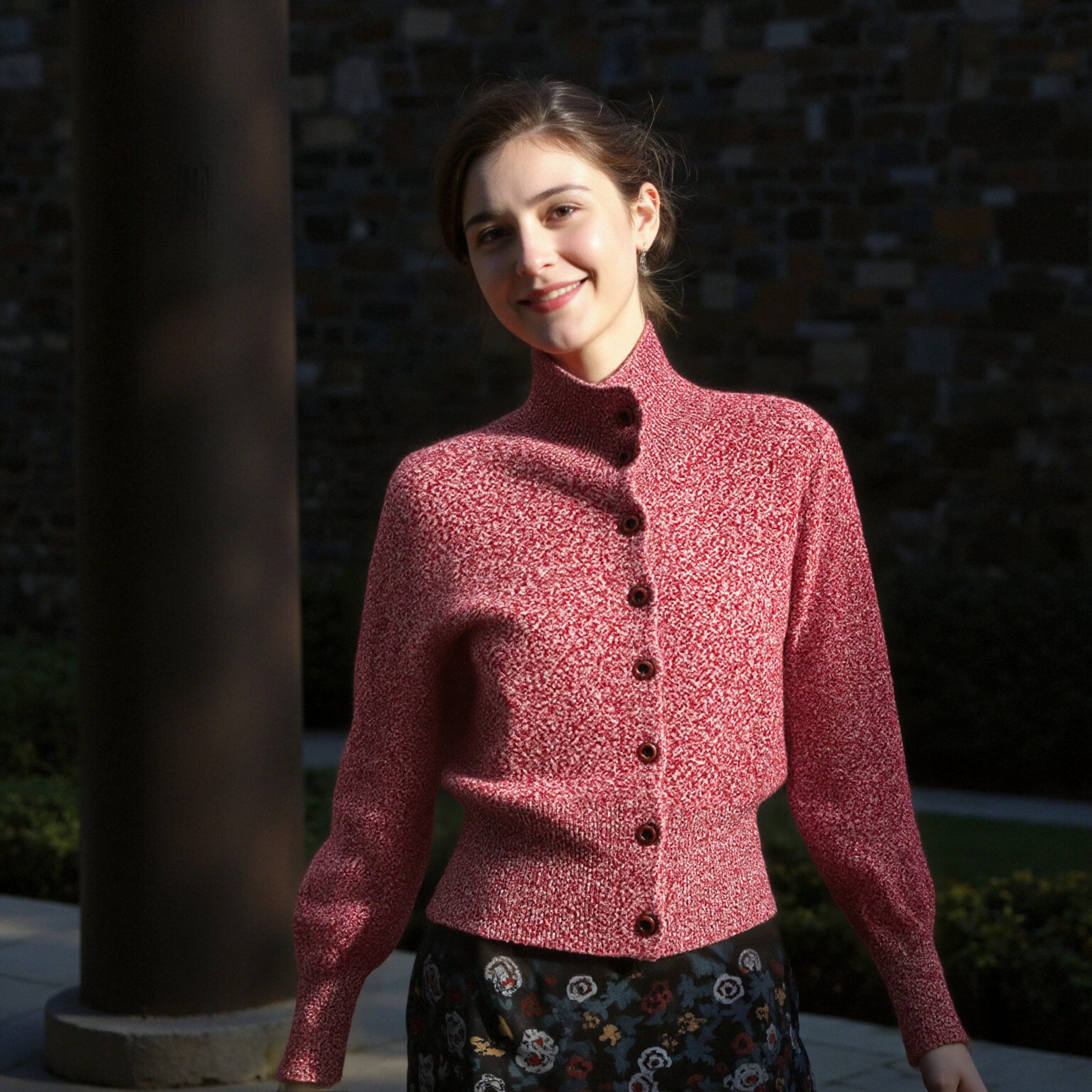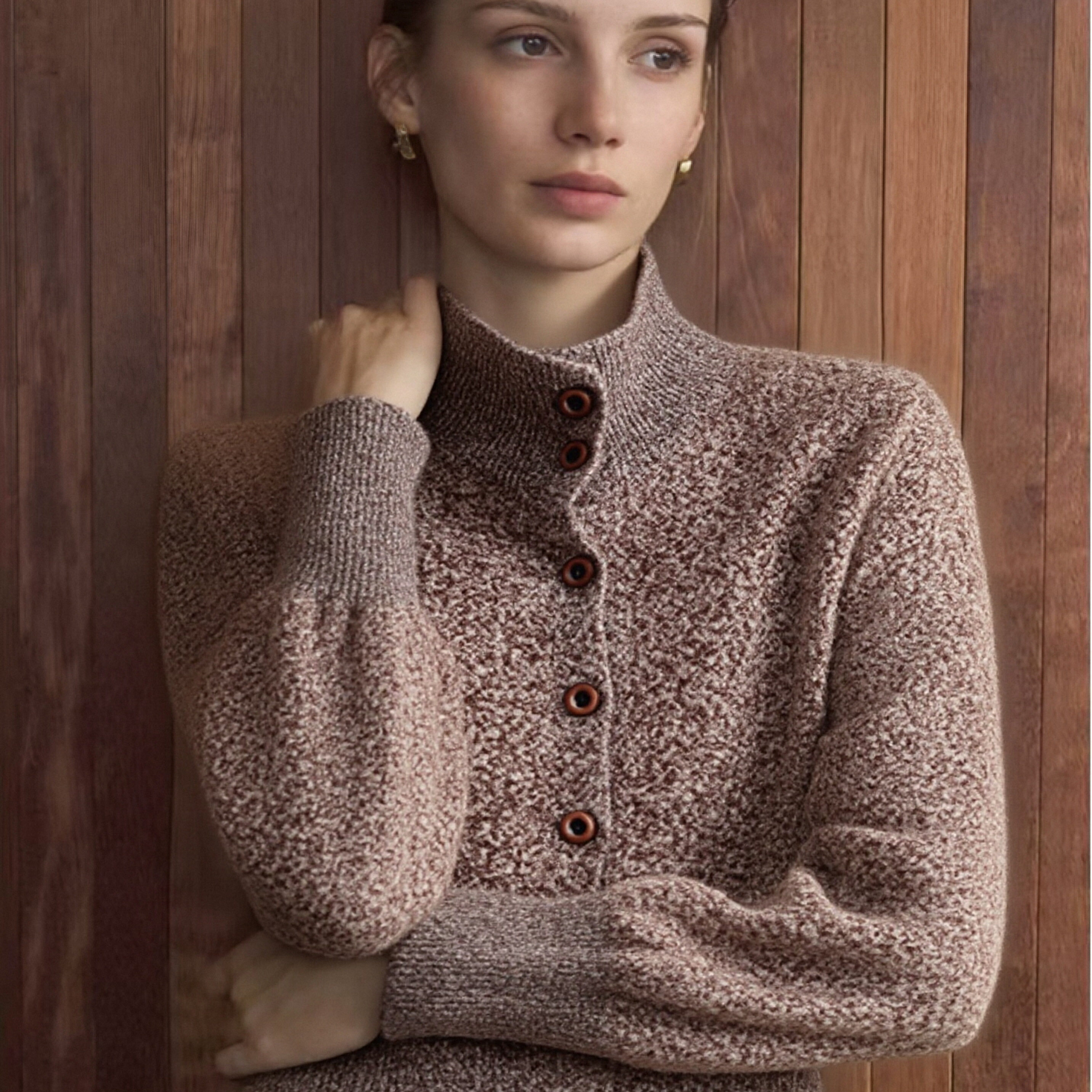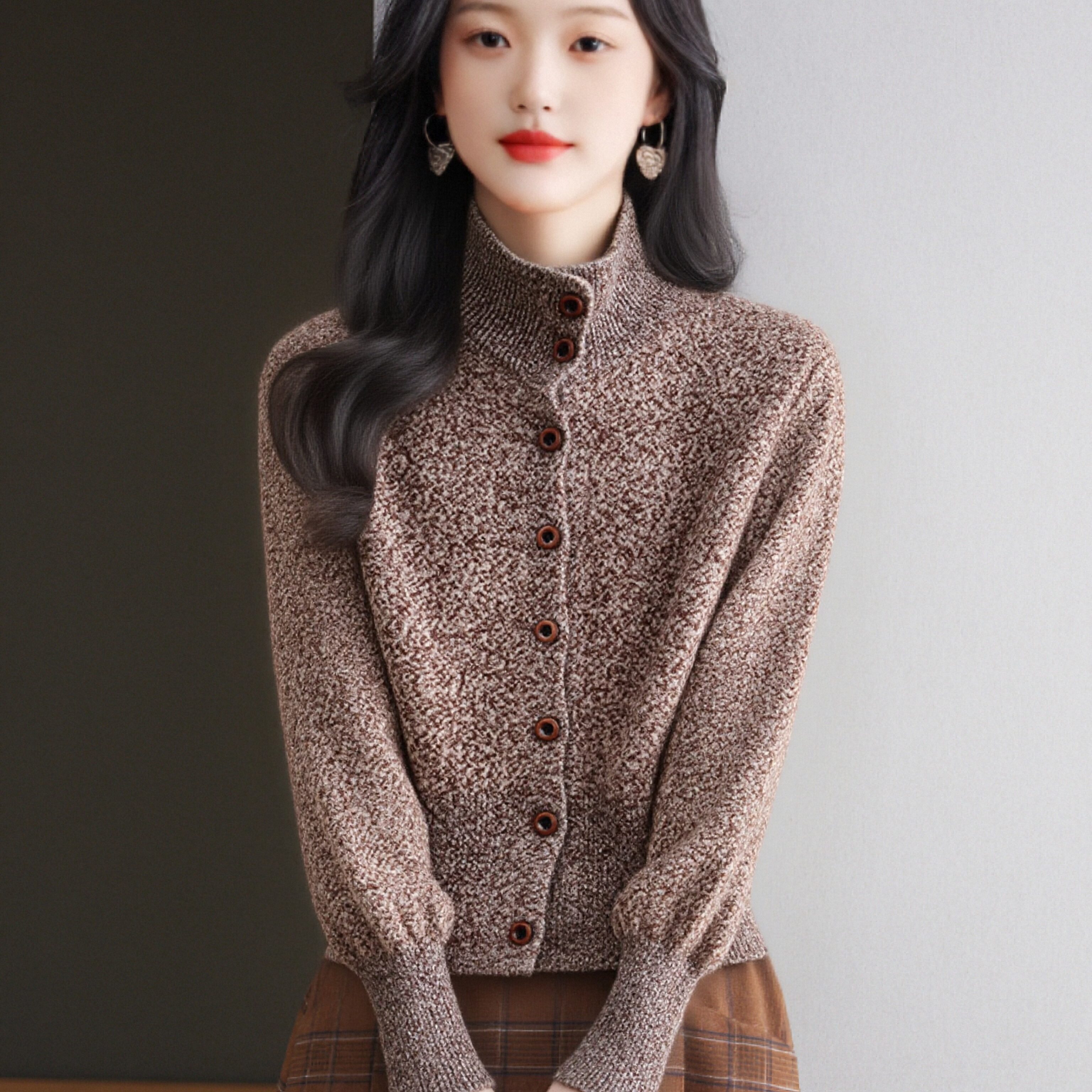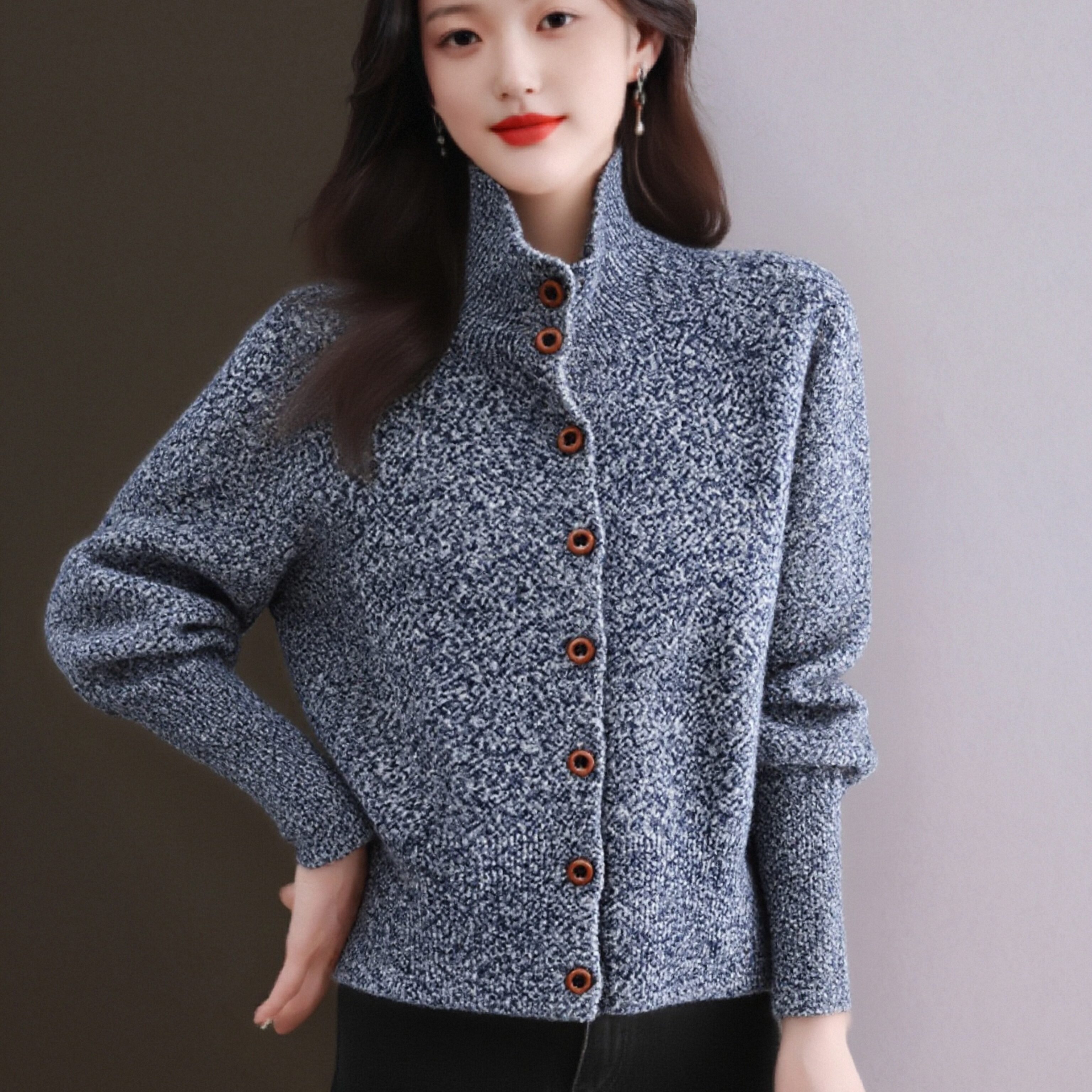 半高领花纱设计长袖针织开衫女