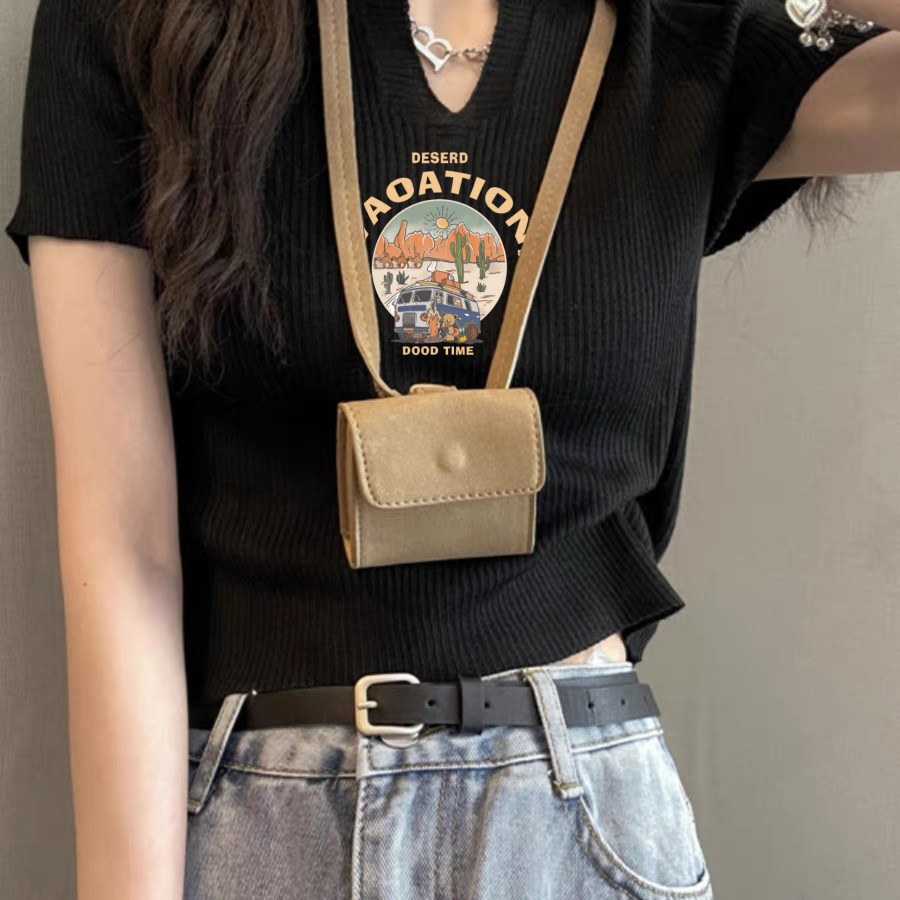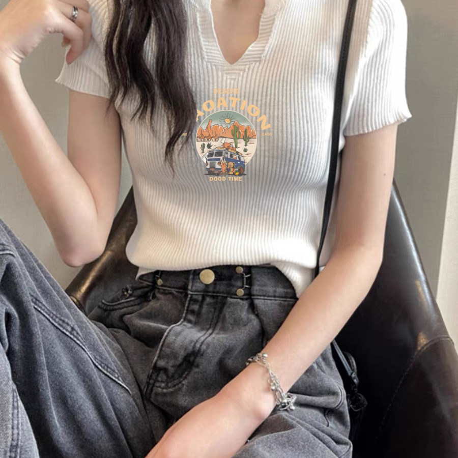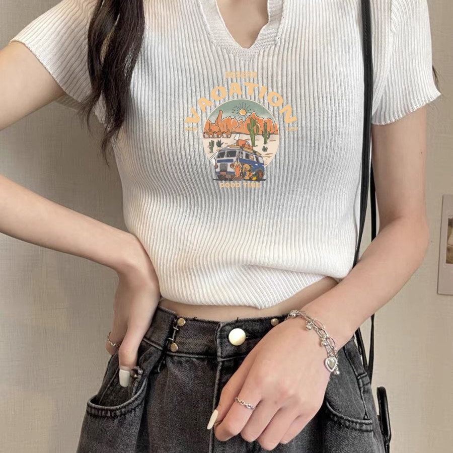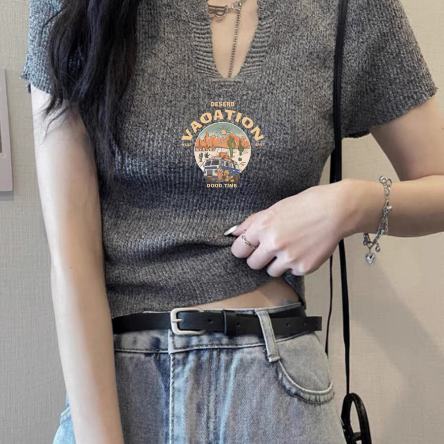 2025夏季新款修身显瘦短款V领T恤女美式复古短袖冰丝针织衫上衣潮
