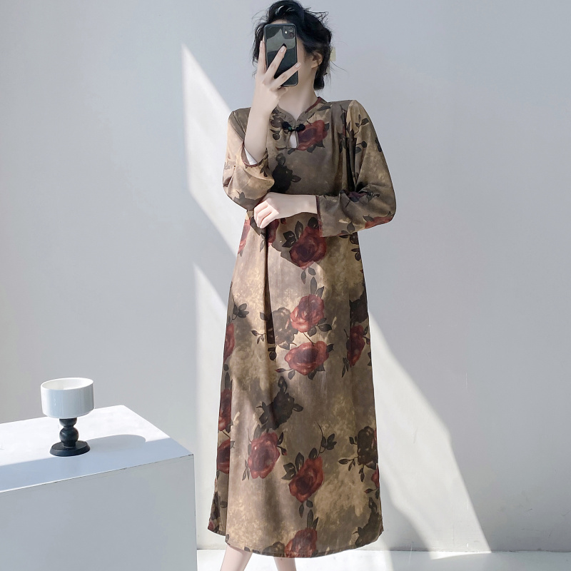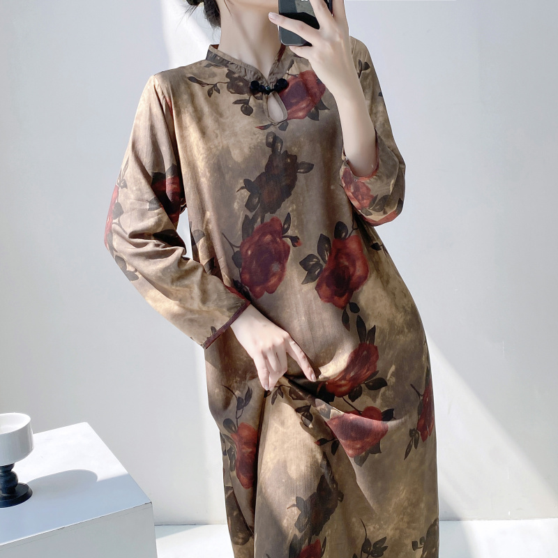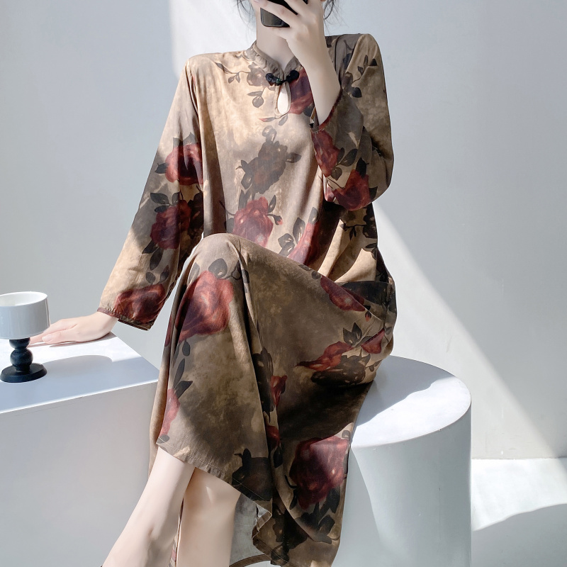 新中式国风棉绸睡裙女夏改良旗袍气质睡衣盘扣古风印花绵绸长袖裙