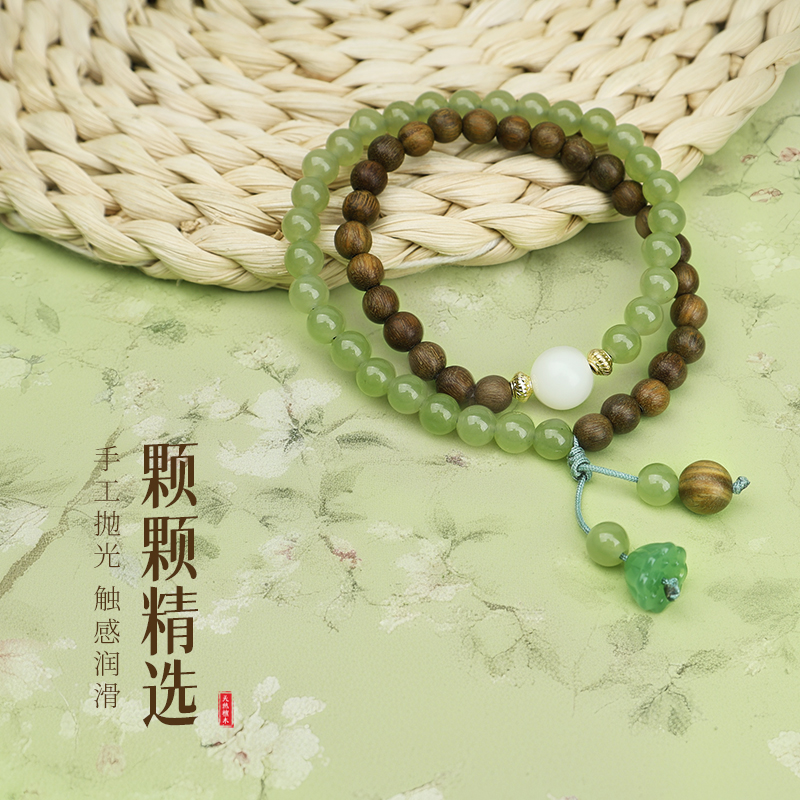 新中式盐源玛瑙绿檀木串珠双圈手链女文艺民族风绿檀岫玉手串