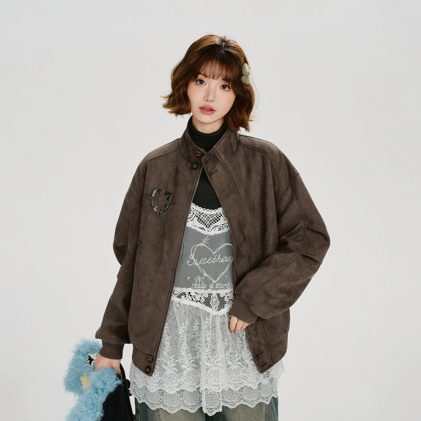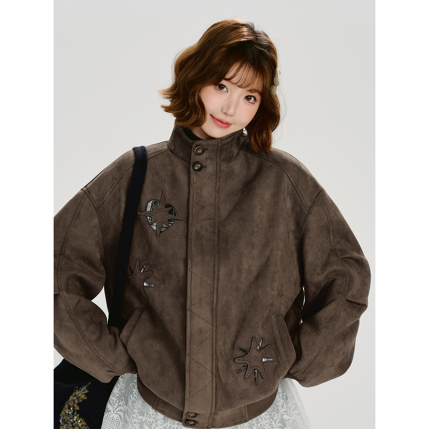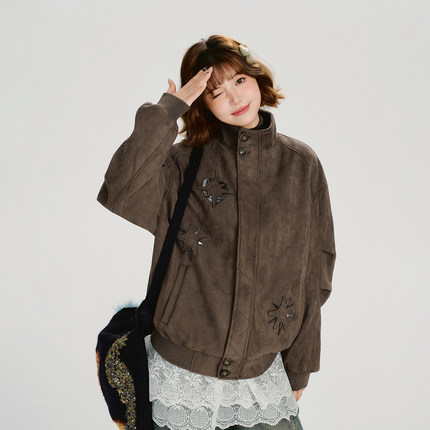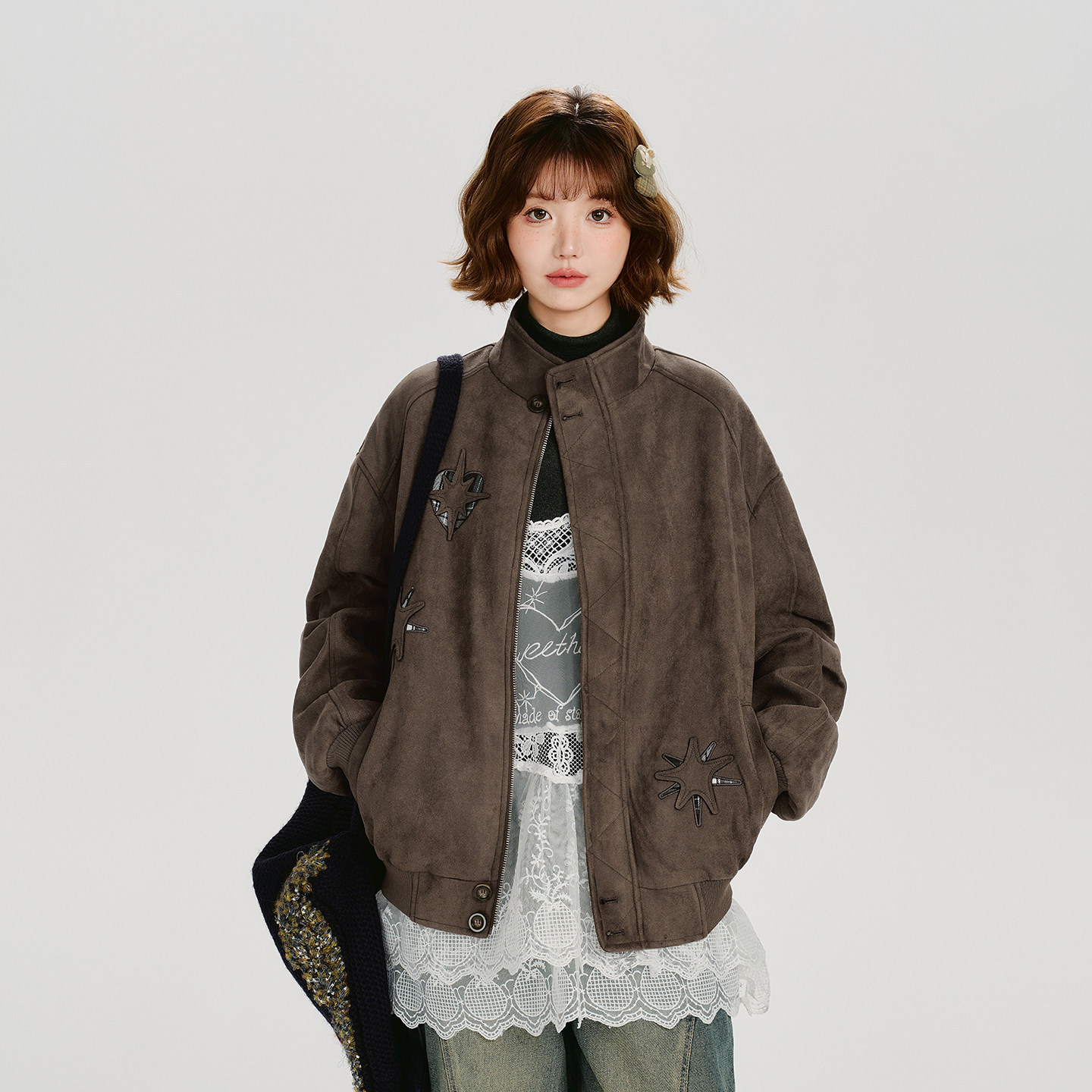 Girlyhalo美式复古立领刺绣夹克外套女冬新款保暖设计感宽松上衣