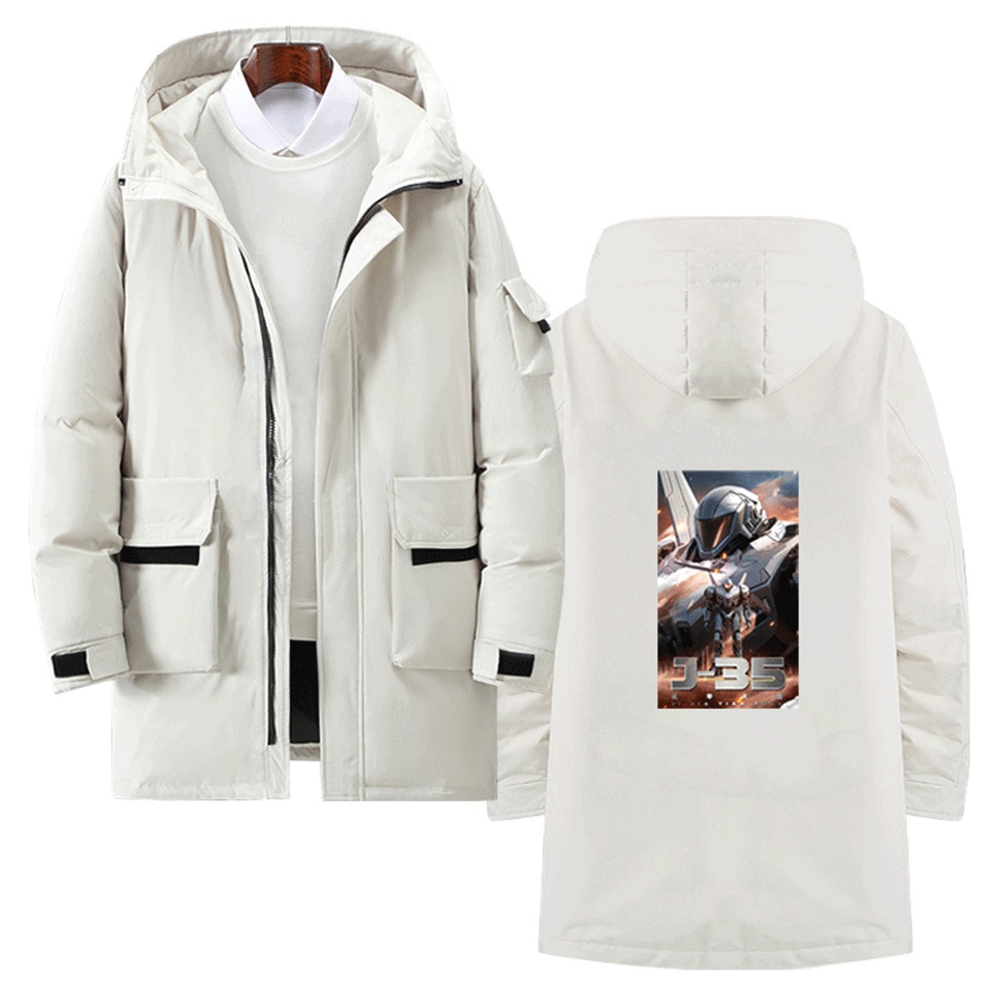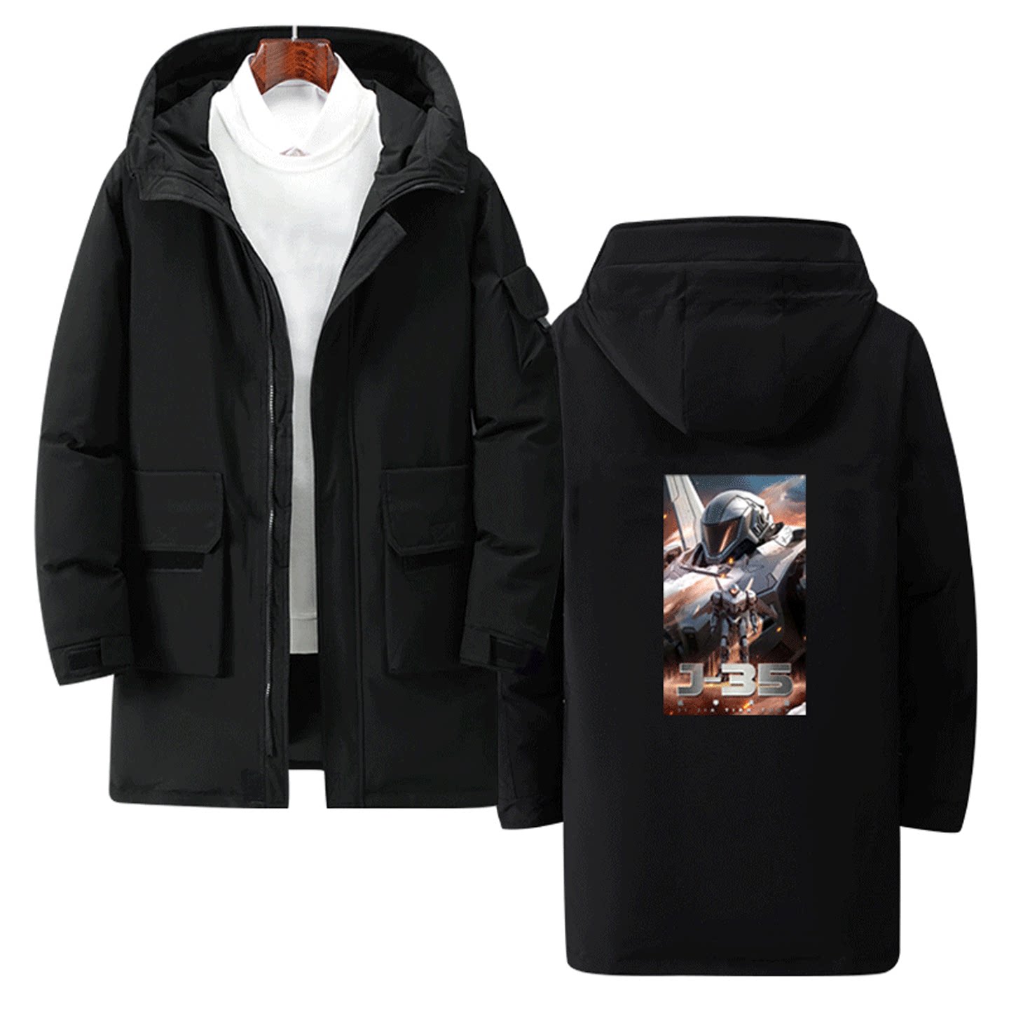 国潮动漫机甲纪元J-35男女秋可定制中长款羽绒服变形战术机甲蓝鲨