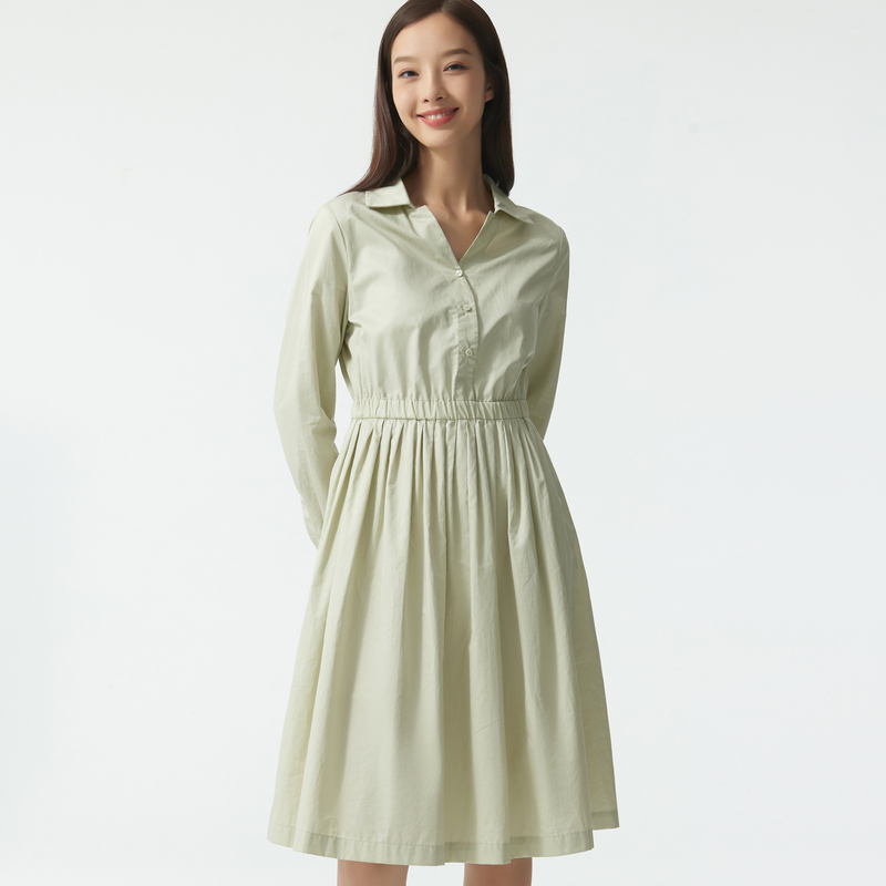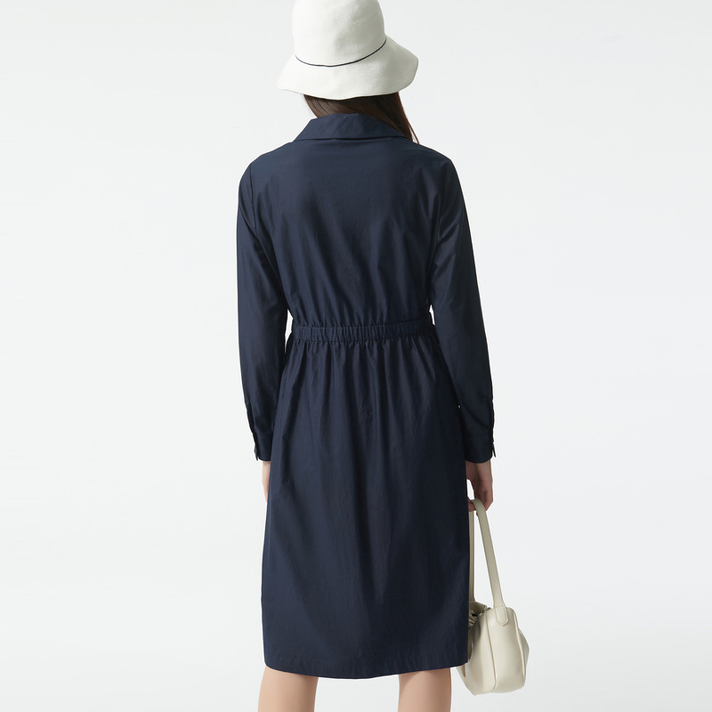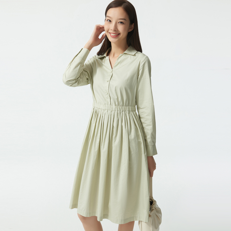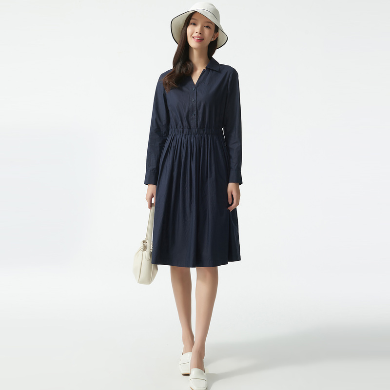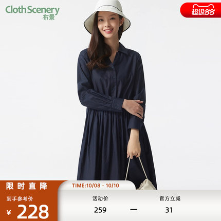 布景连衣裙女秋季商场同款翻领小V领高腰纯棉长袖中长衬衫裙0259