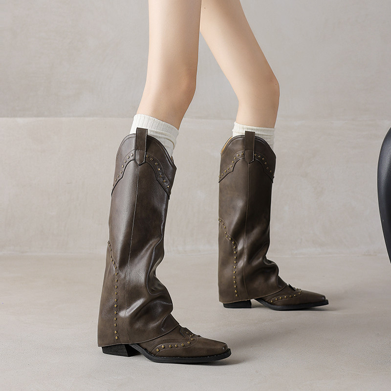 5cm复古尖头西部靴女2025新款小众铆钉裤管靴百搭显瘦粗跟长筒靴
