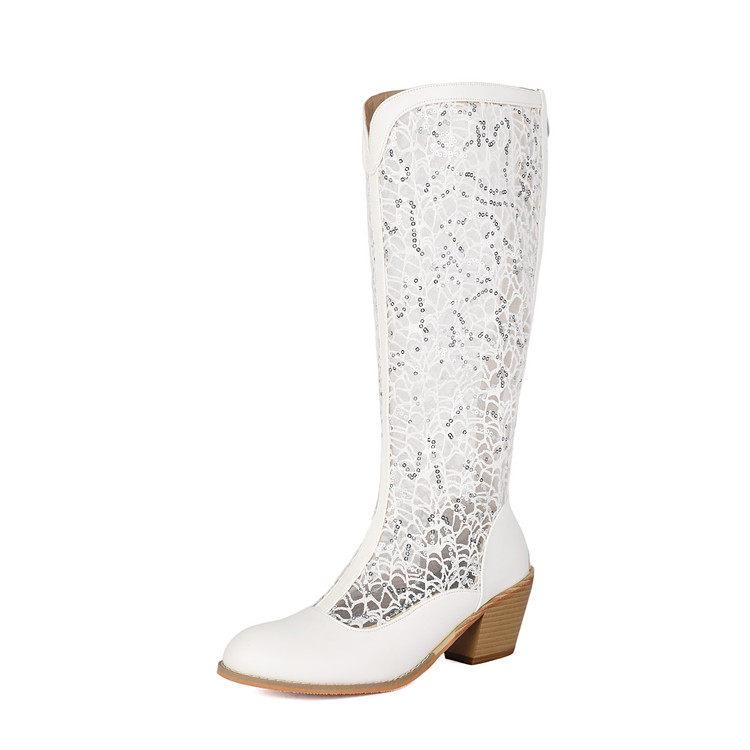 春秋单靴白色靴子高筒靴女粗跟高跟镂空网靴夏靴凉靴子大码女靴SH