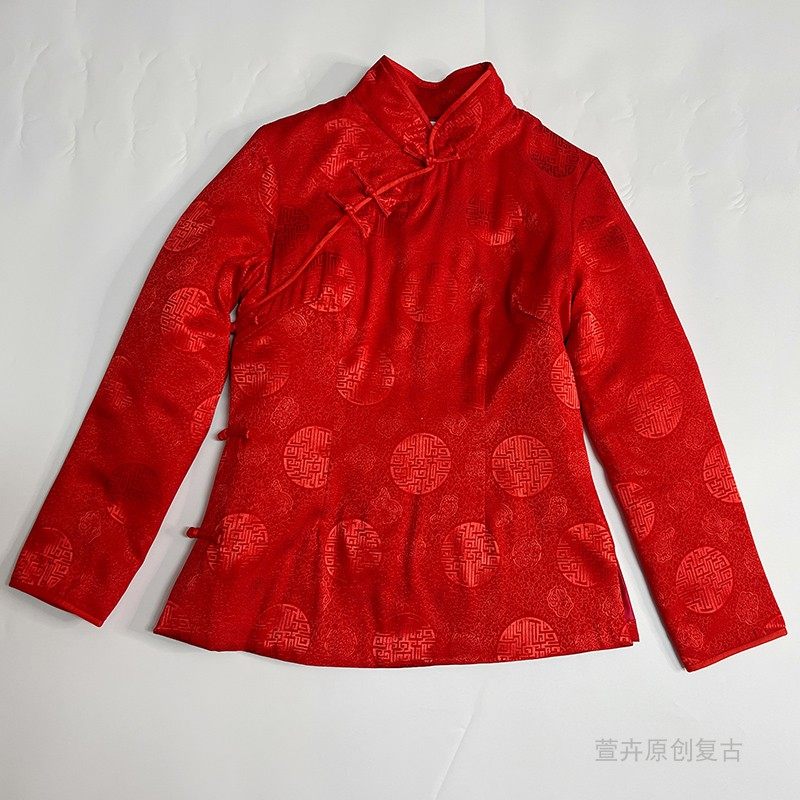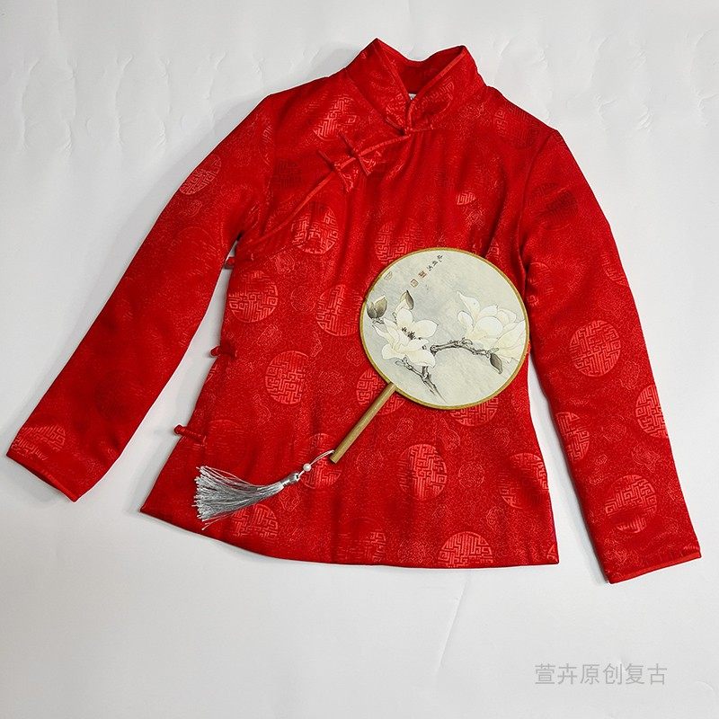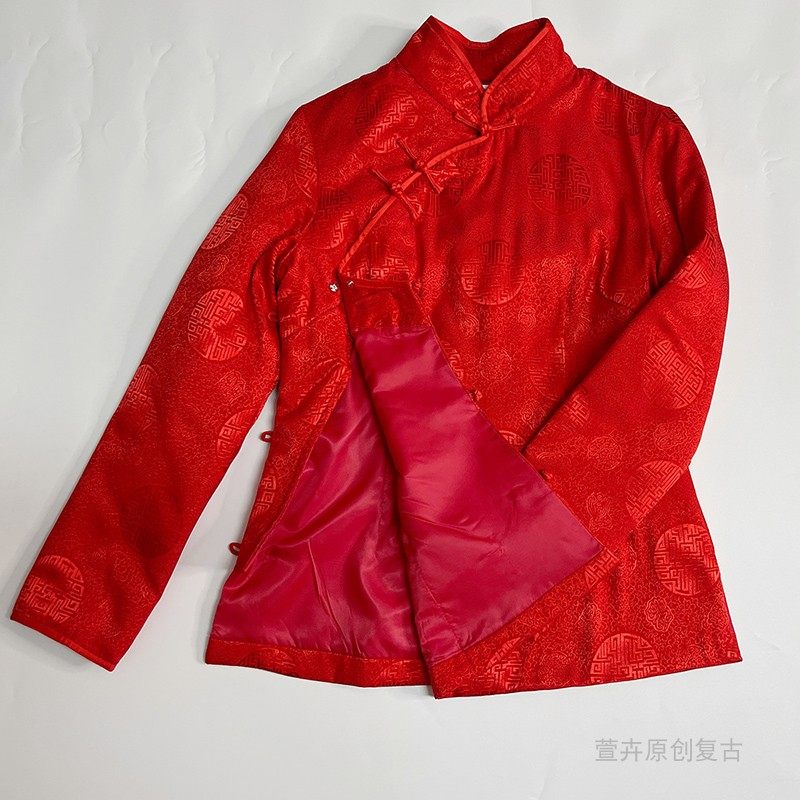 萱卉冬季新款中式旗袍上衣女士加棉保暖中国红复古全开襟唐装礼服